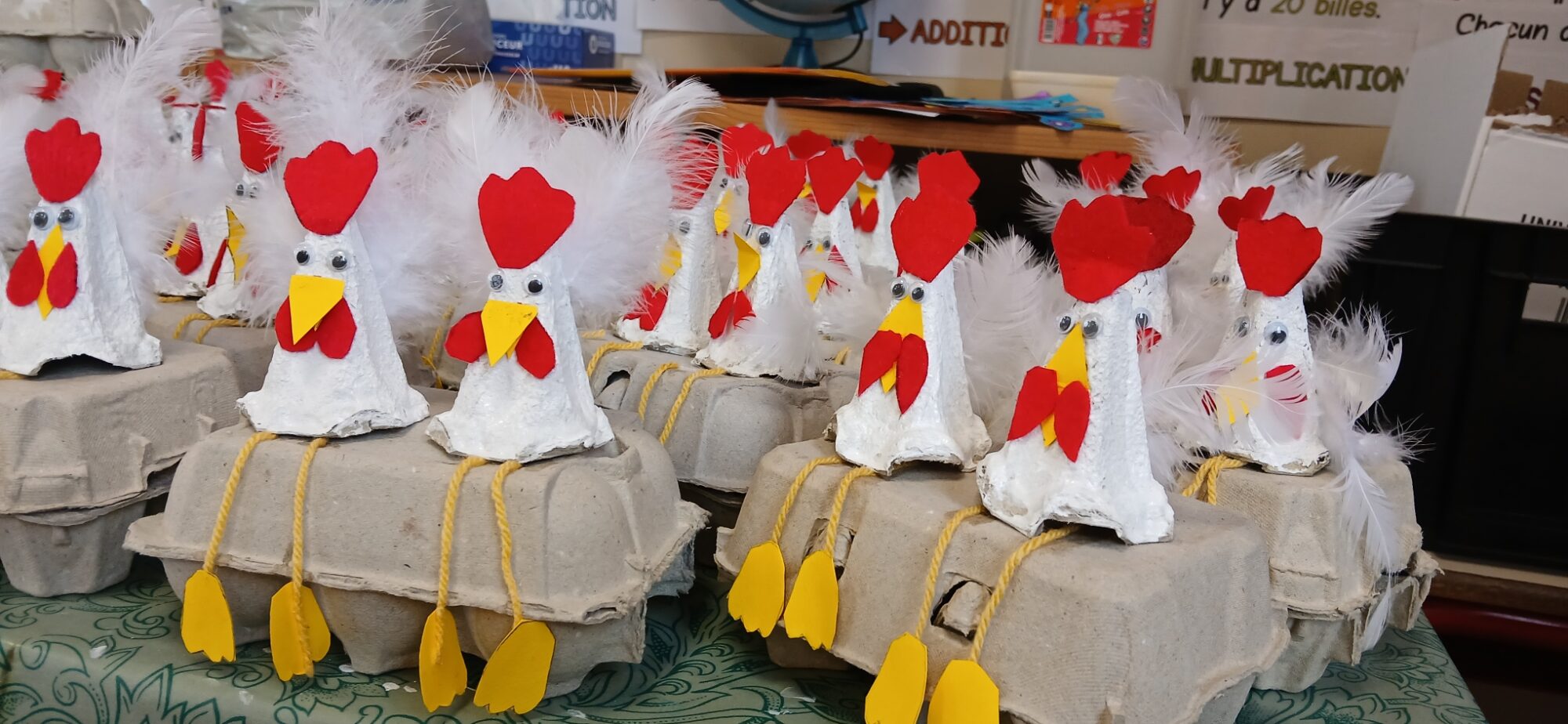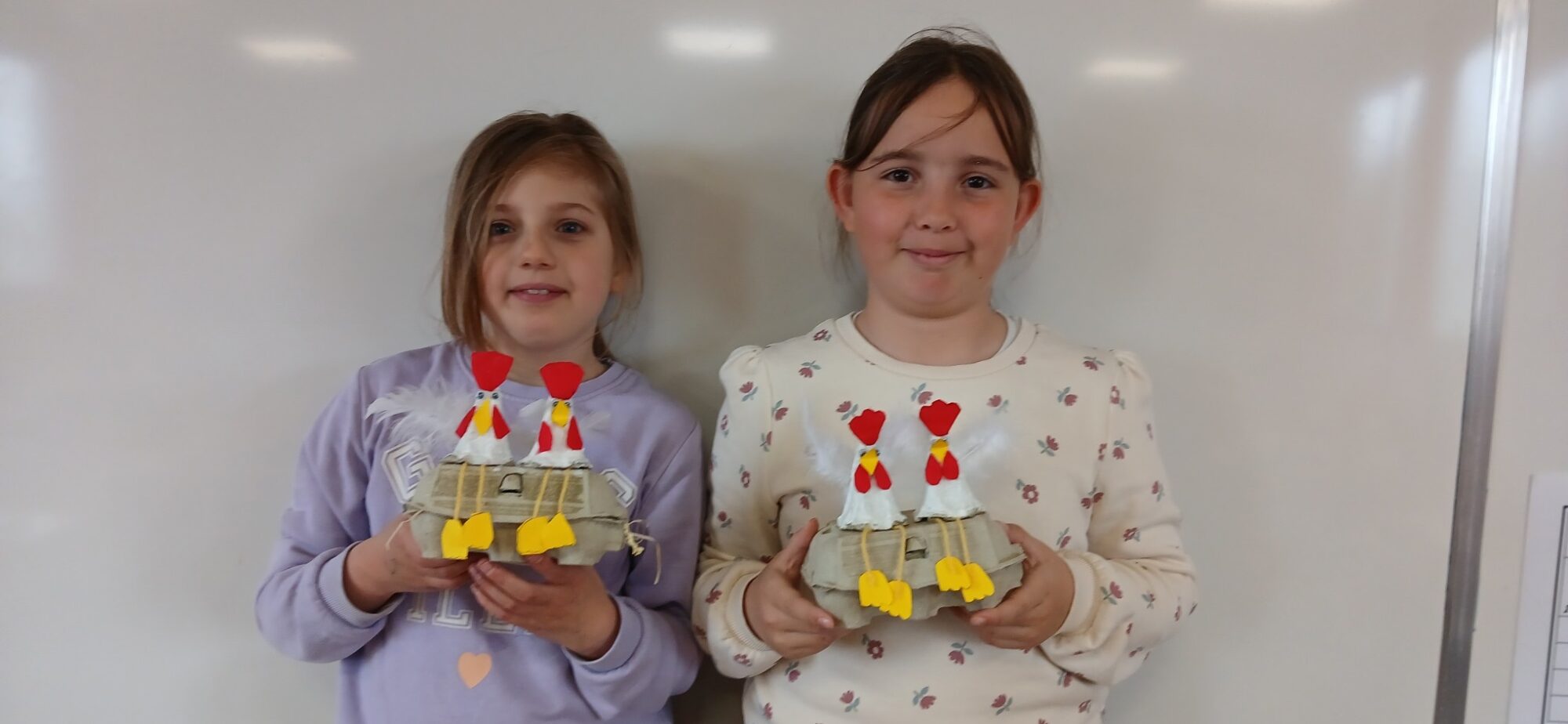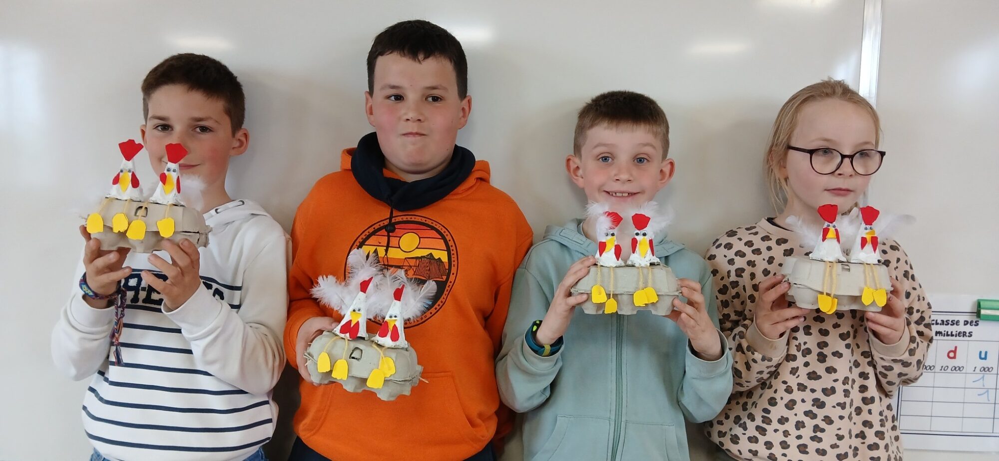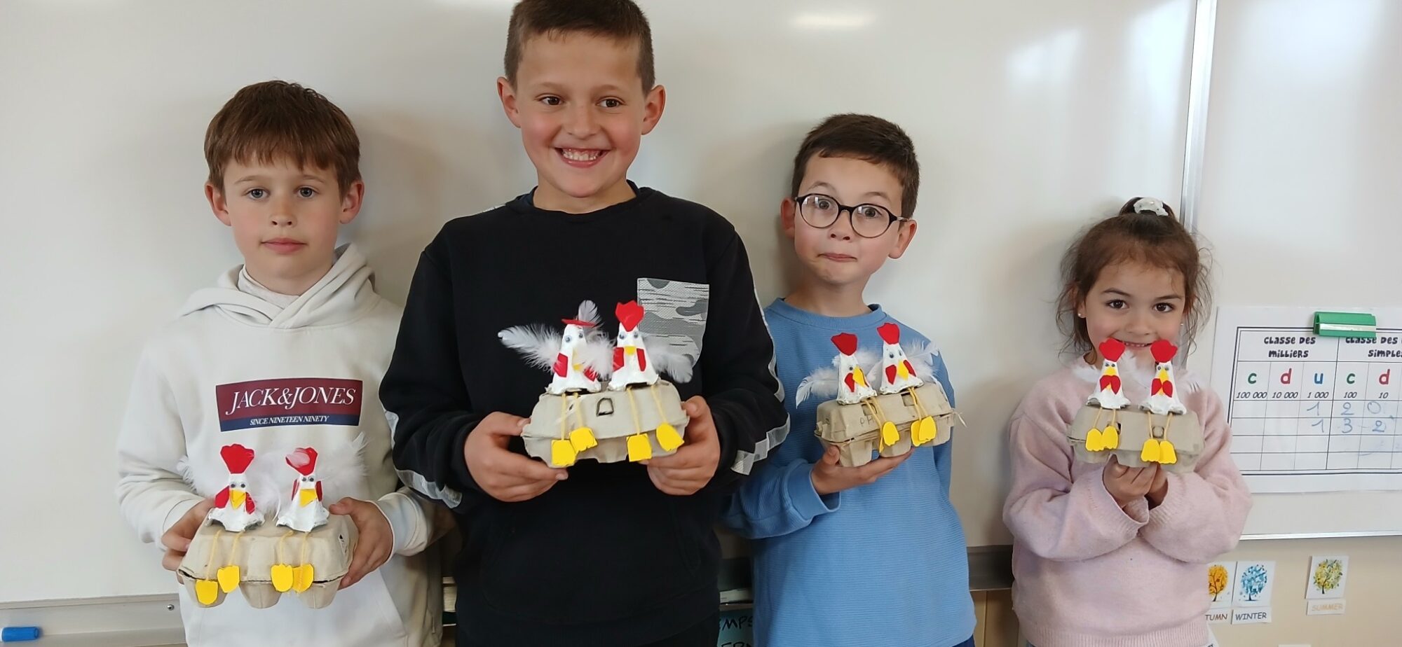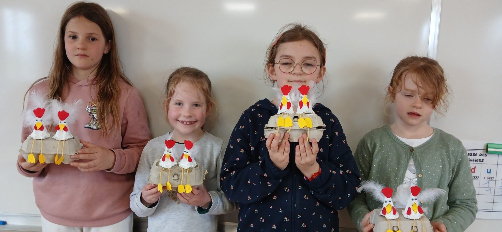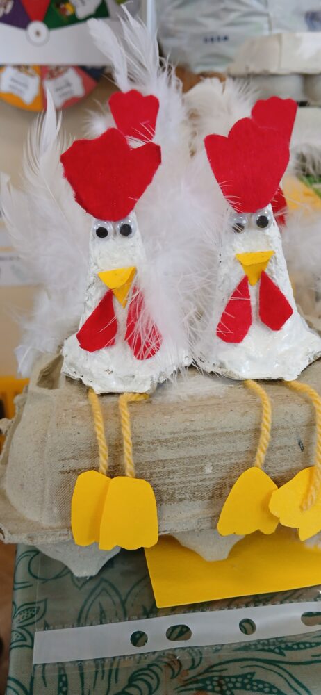Les élèves de CE1/CE2 ont préparé pour Pâques une boite à oeufs décorée de deux petites poules : peinture, découpage, collage… de quoi s’entraîner à la motricité fine. Il ne restait plus qu’à attendre que les cloches passent !