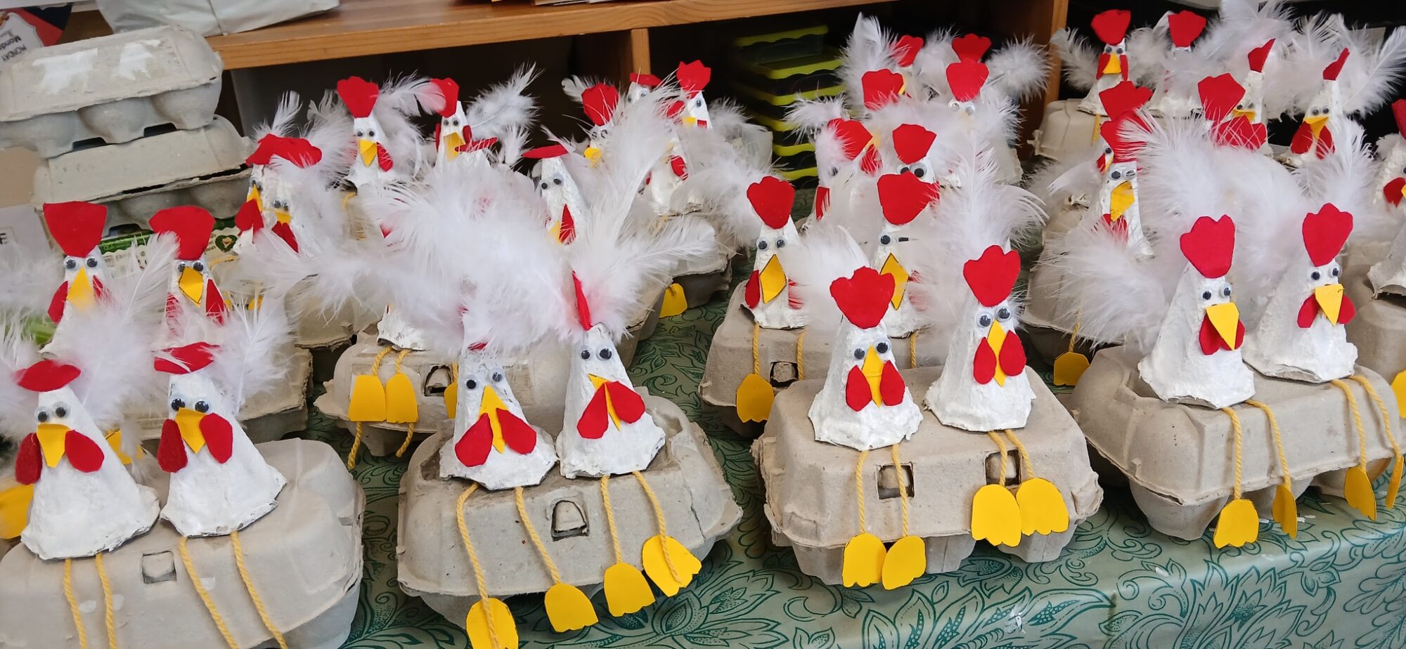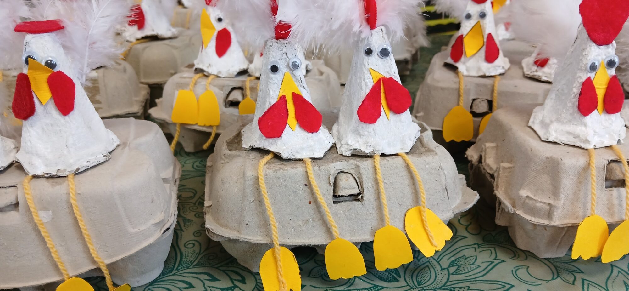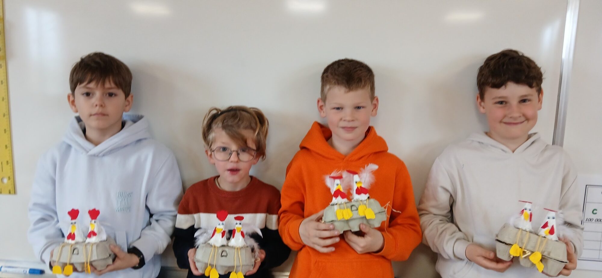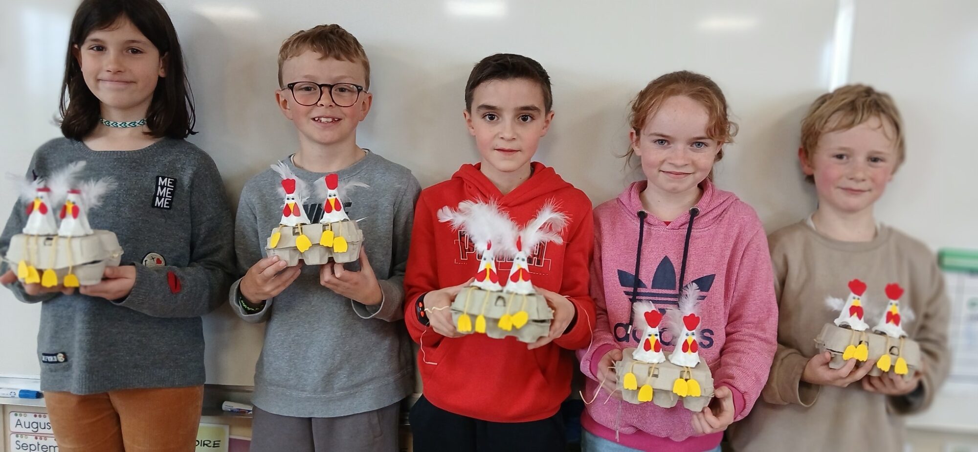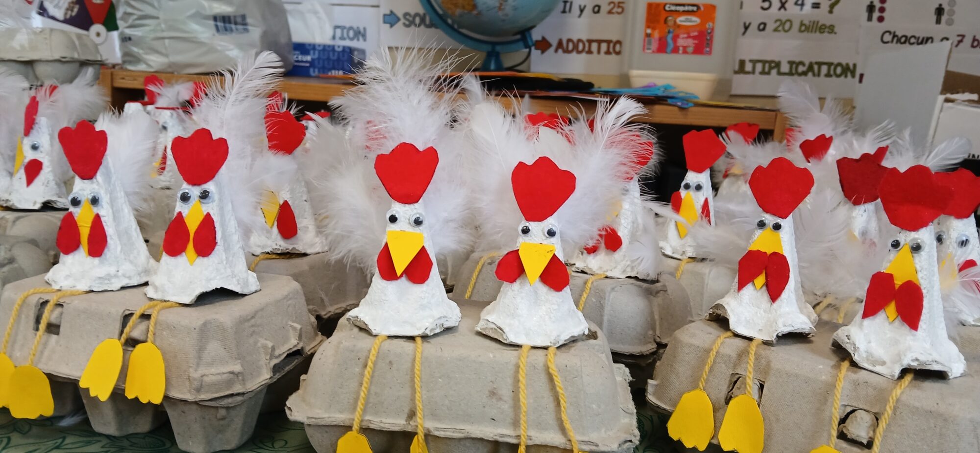 Les élèves de CE1/CE2 ont préparé pour Pâques une boite à oeufs décorée de deux petites poules : peinture, découpage, collage… de quoi s’entraîner à la motricité fine. Il ne restait plus qu’à attendre que les cloches passent !