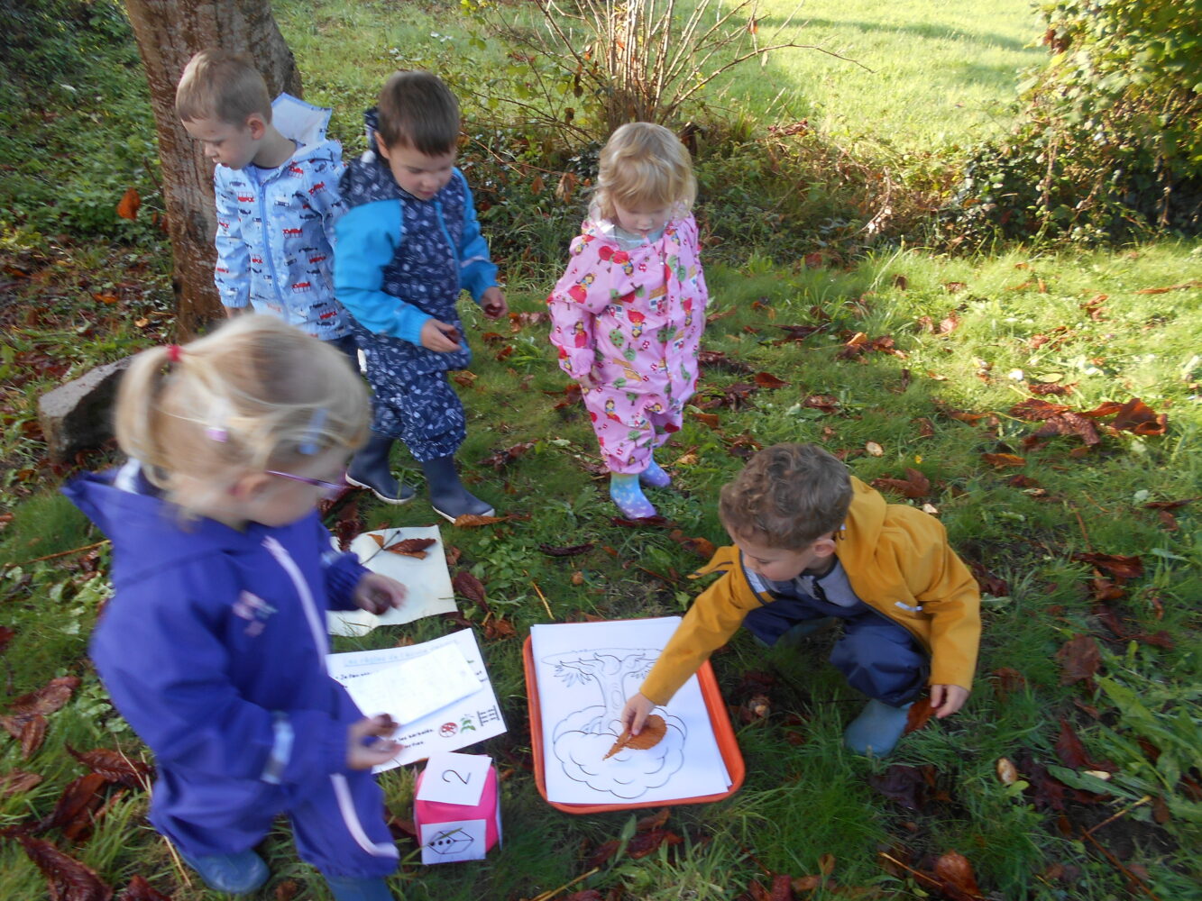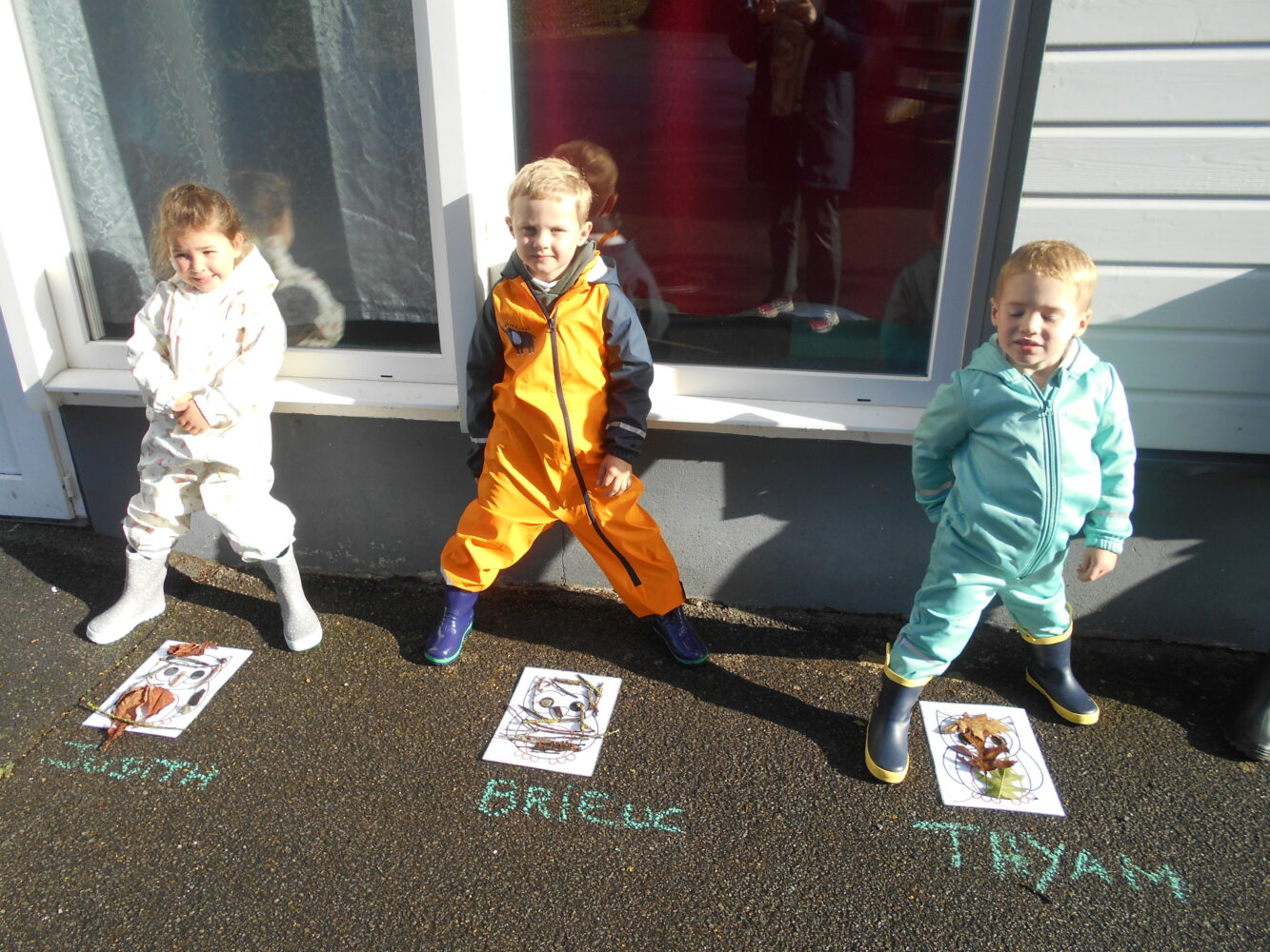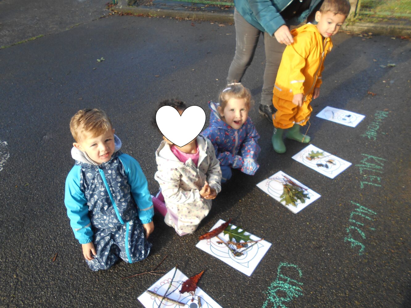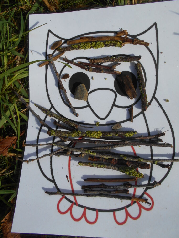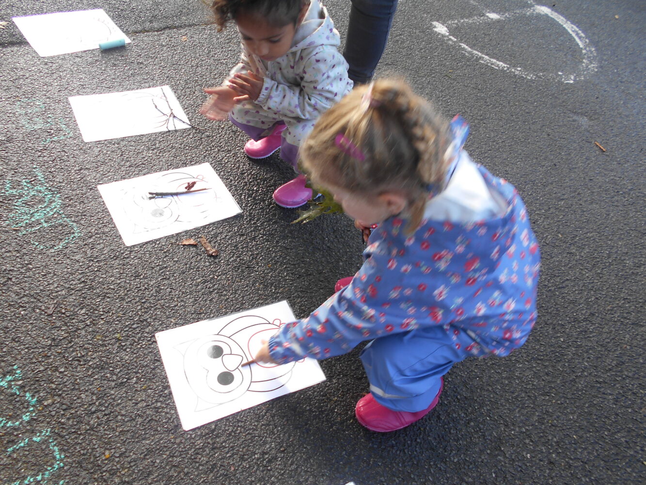 Nous avons commencé par découvrir le marronnier et dire bonjour à la nature en le touchant. Nous nous sommes ensuite installés en regroupement pour se connecter quelques minutes avec la nature : écouter les bruits, observer la nature et découvrir les trois règles de sécurité : toujours voir un adulte, ne rien mettre à la bouche et ne pas abîmer la nature. Ensuite, nous avons participé aux ateliers en petits groupes : land art (décorer un hibou avec des éléments naturels), « jeu de l’arbre » en numération jusqu’ à 3, « la chasse aux couleurs », et les traits à la craie sur la cour pour le graphisme.
