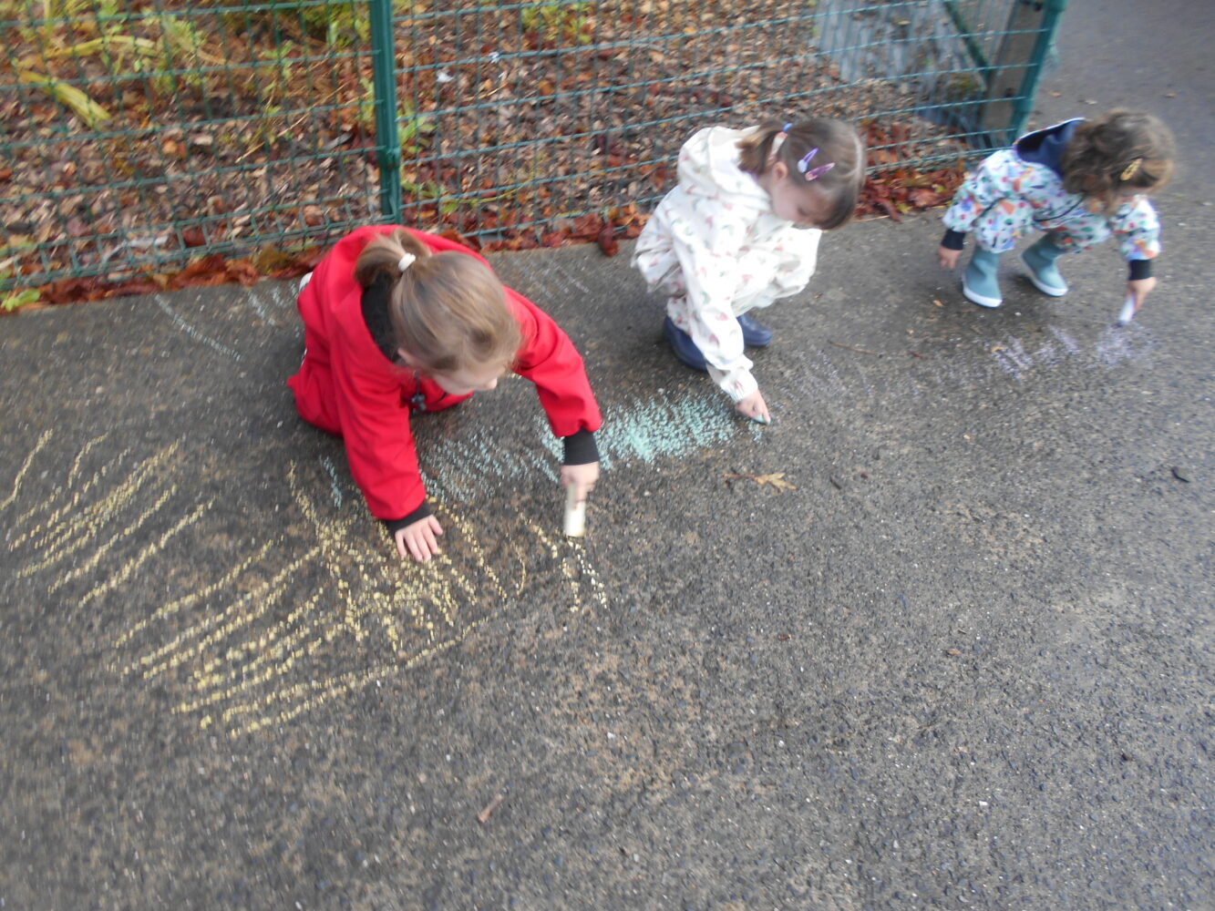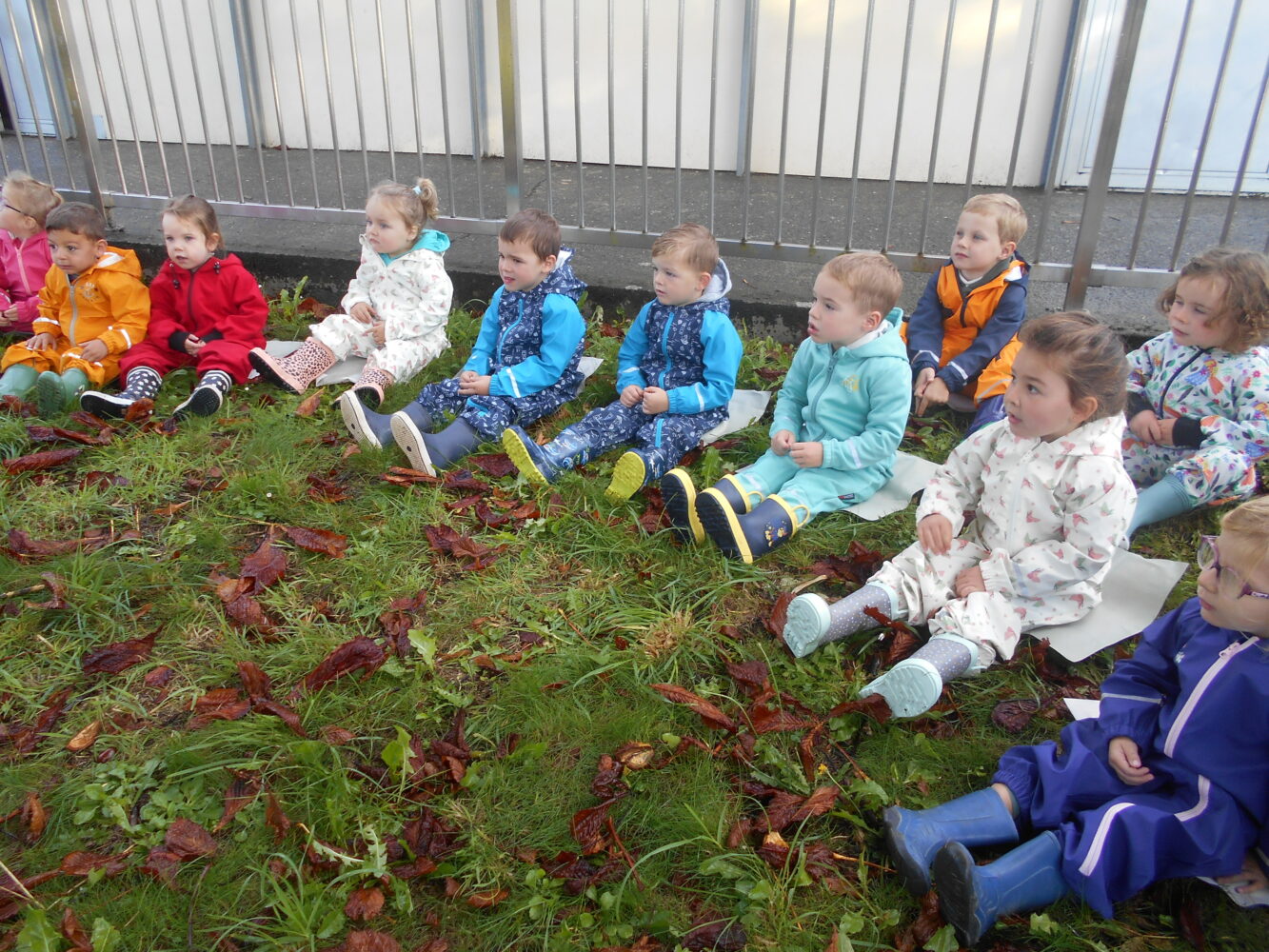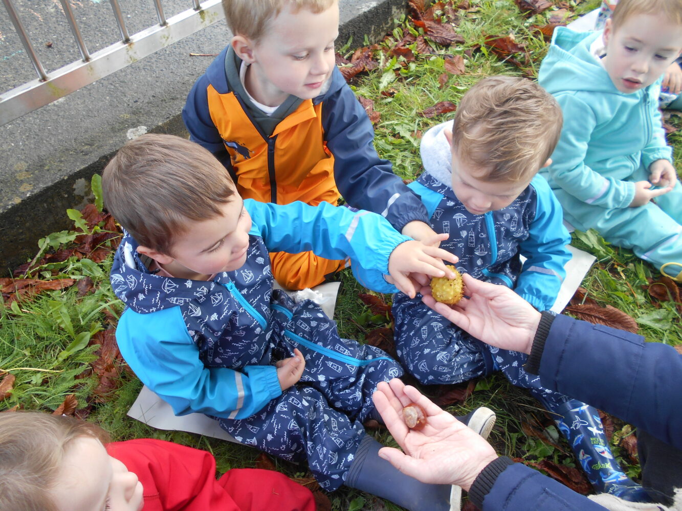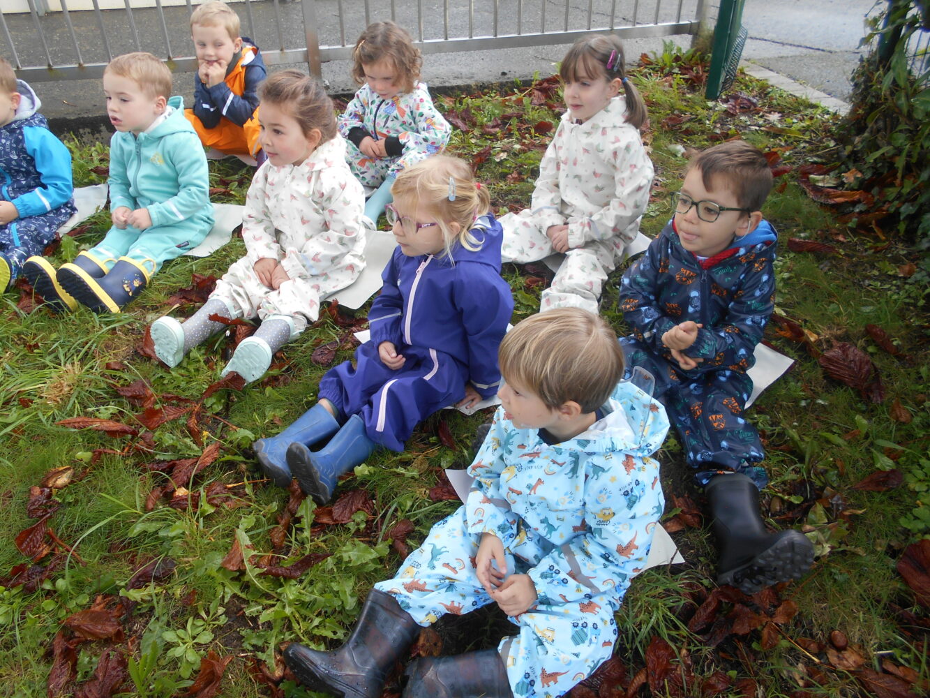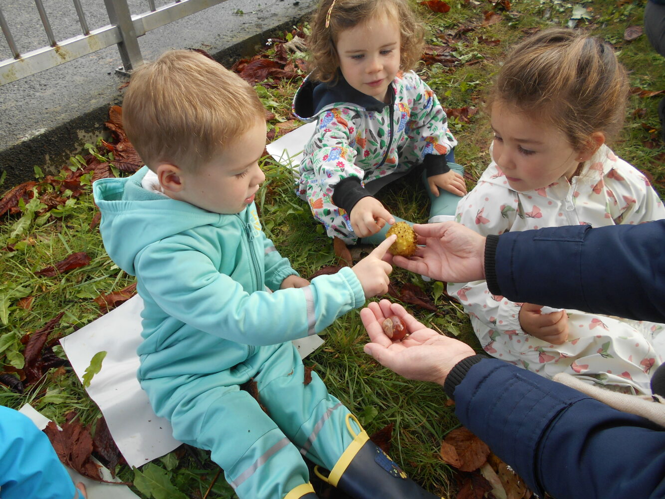 Nous avons commencé par découvrir le marronnier et dire bonjour à la nature en le touchant. Nous nous sommes ensuite installés en regroupement pour se connecter quelques minutes avec la nature : écouter les bruits, observer la nature et découvrir les trois règles de sécurité : toujours voir un adulte, ne rien mettre à la bouche et ne pas abîmer la nature. Ensuite, nous avons participé aux ateliers en petits groupes : land art (décorer un hibou avec des éléments naturels), « jeu de l’arbre » en numération jusqu’ à 3, « la chasse aux couleurs », et les traits à la craie sur la cour pour le graphisme.