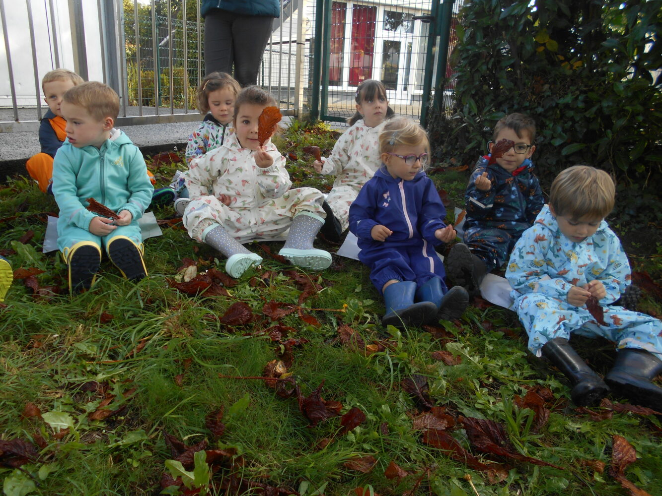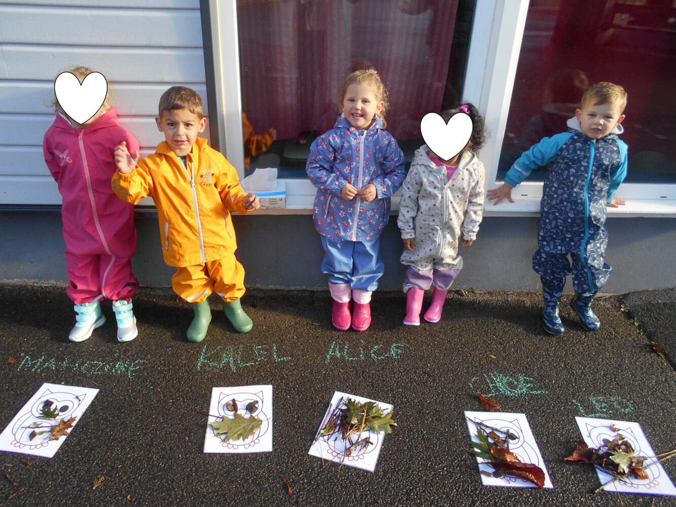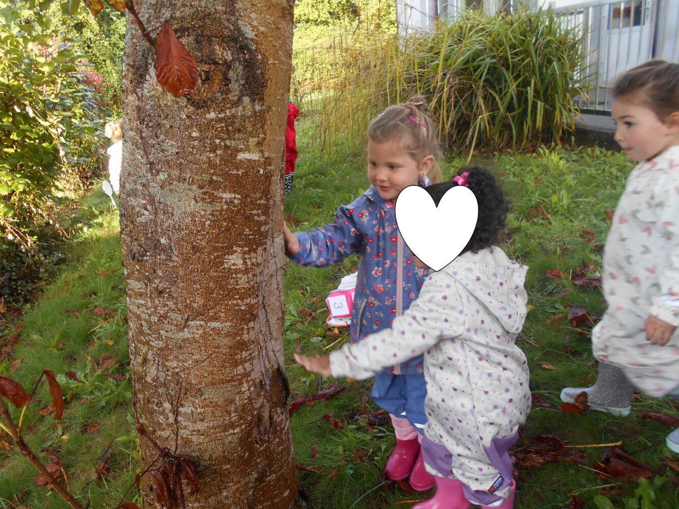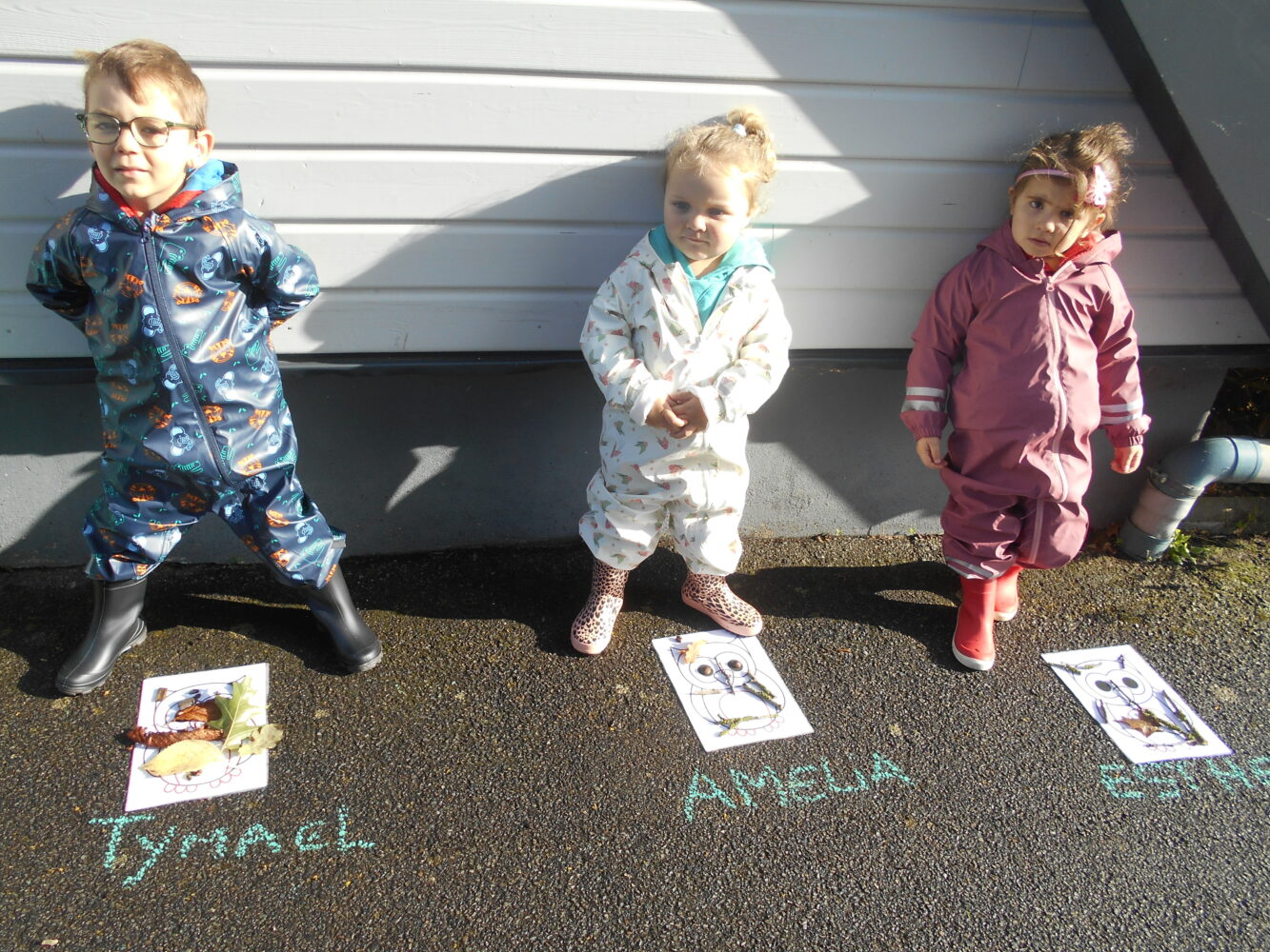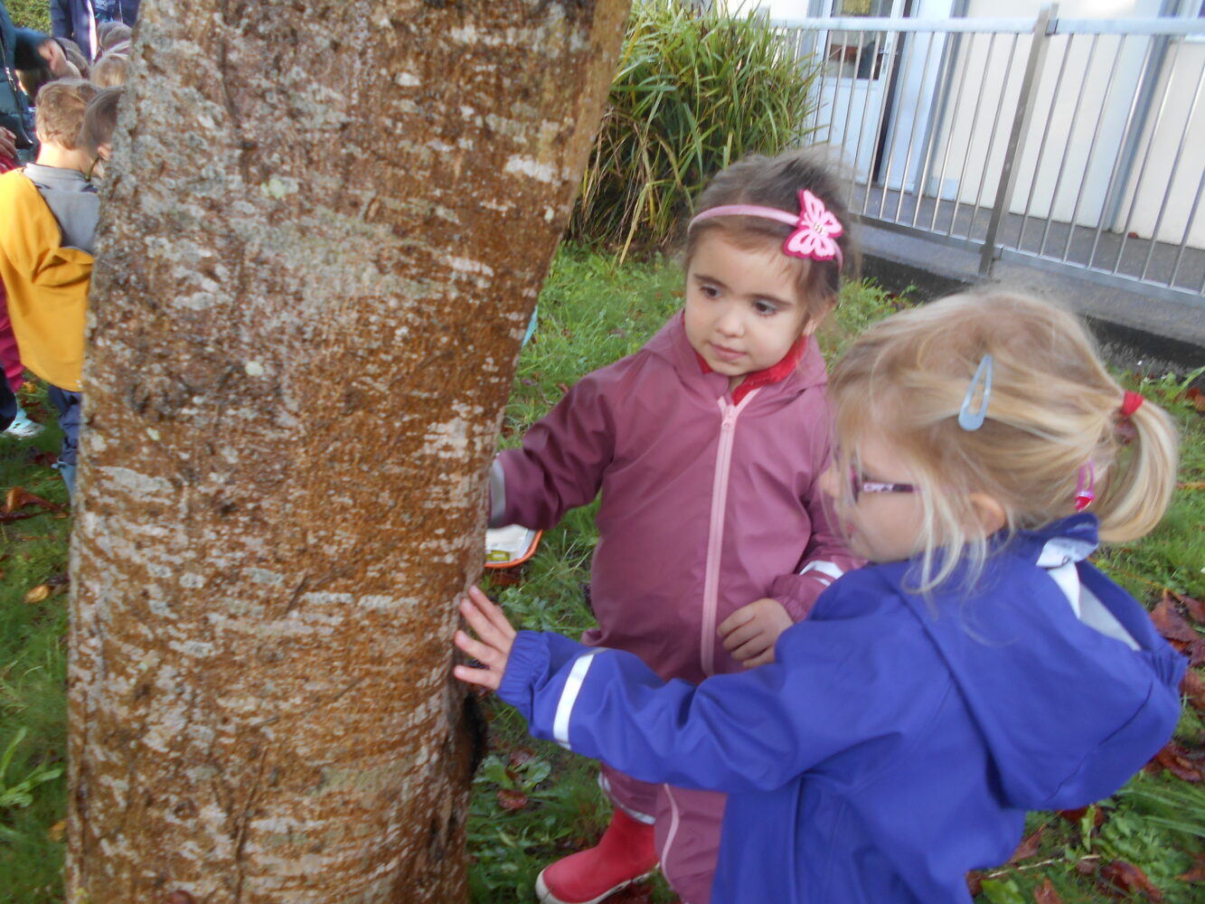 Nous avons commencé par découvrir le marronnier et dire bonjour à la nature en le touchant. Nous nous sommes ensuite installés en regroupement pour se connecter quelques minutes avec la nature : écouter les bruits, observer la nature et découvrir les trois règles de sécurité : toujours voir un adulte, ne rien mettre à la bouche et ne pas abîmer la nature. Ensuite, nous avons participé aux ateliers en petits groupes : land art (décorer un hibou avec des éléments naturels), « jeu de l’arbre » en numération jusqu’ à 3, « la chasse aux couleurs », et les traits à la craie sur la cour pour le graphisme.