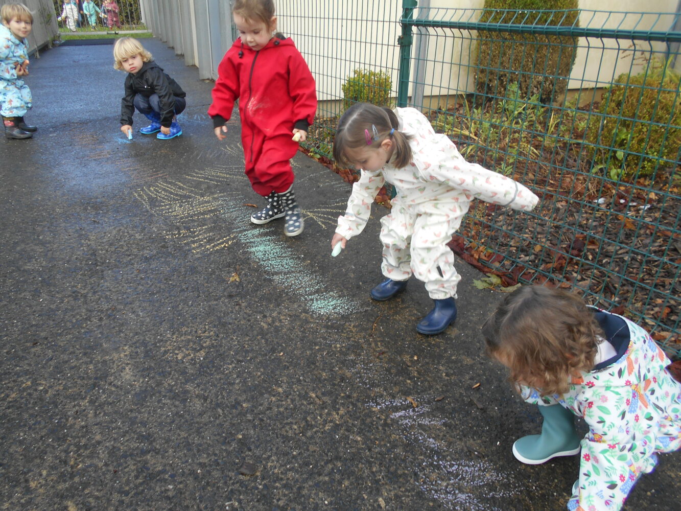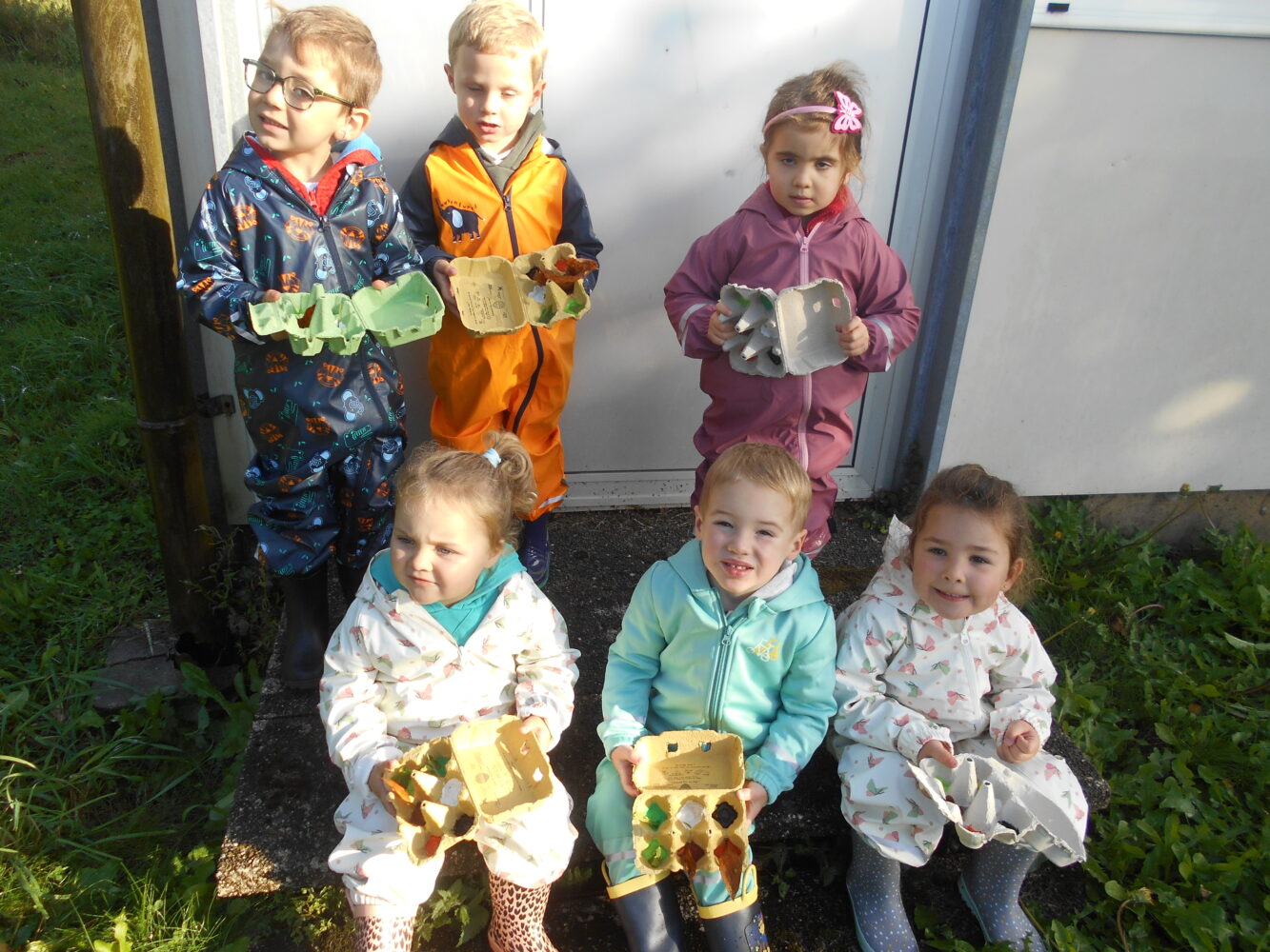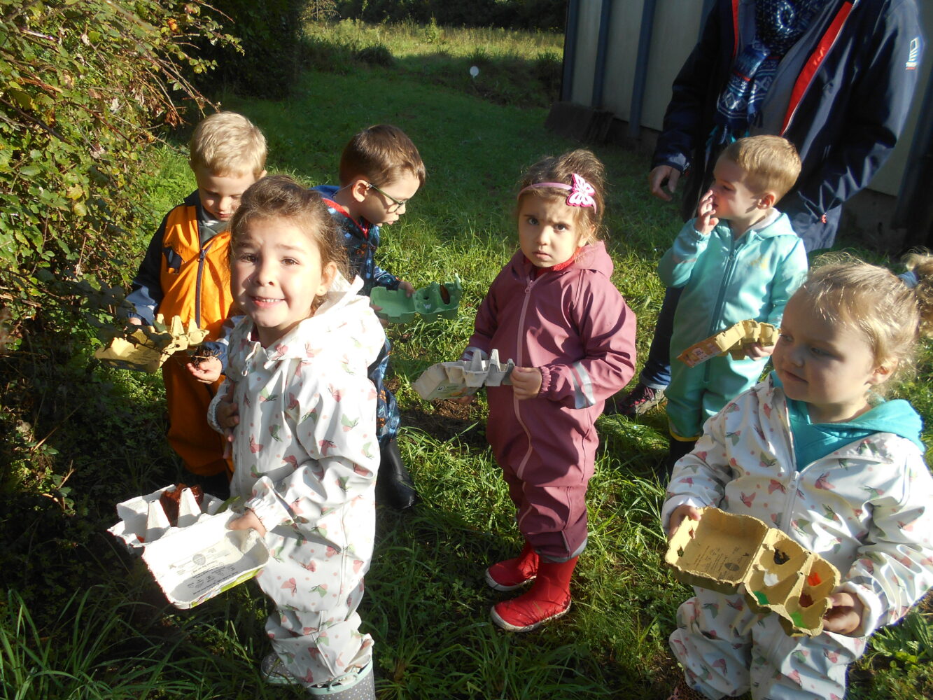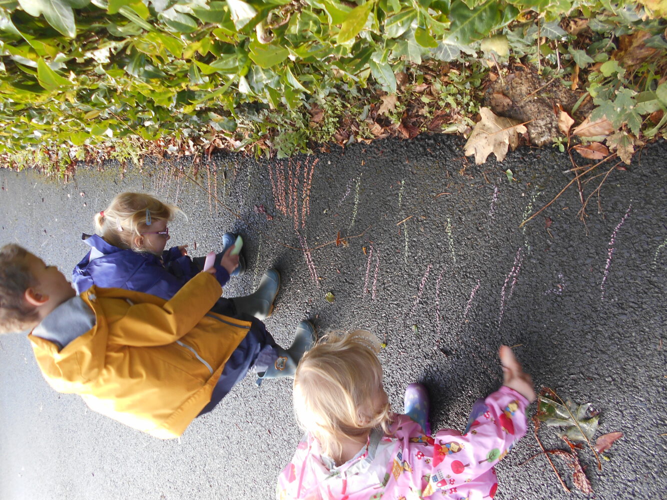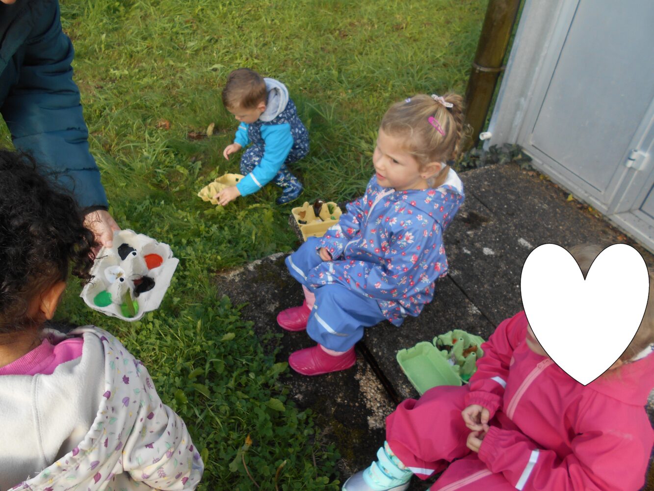 Nous avons commencé par découvrir le marronnier et dire bonjour à la nature en le touchant. Nous nous sommes ensuite installés en regroupement pour se connecter quelques minutes avec la nature : écouter les bruits, observer la nature et découvrir les trois règles de sécurité : toujours voir un adulte, ne rien mettre à la bouche et ne pas abîmer la nature. Ensuite, nous avons participé aux ateliers en petits groupes : land art (décorer un hibou avec des éléments naturels), « jeu de l’arbre » en numération jusqu’ à 3, « la chasse aux couleurs », et les traits à la craie sur la cour pour le graphisme.
