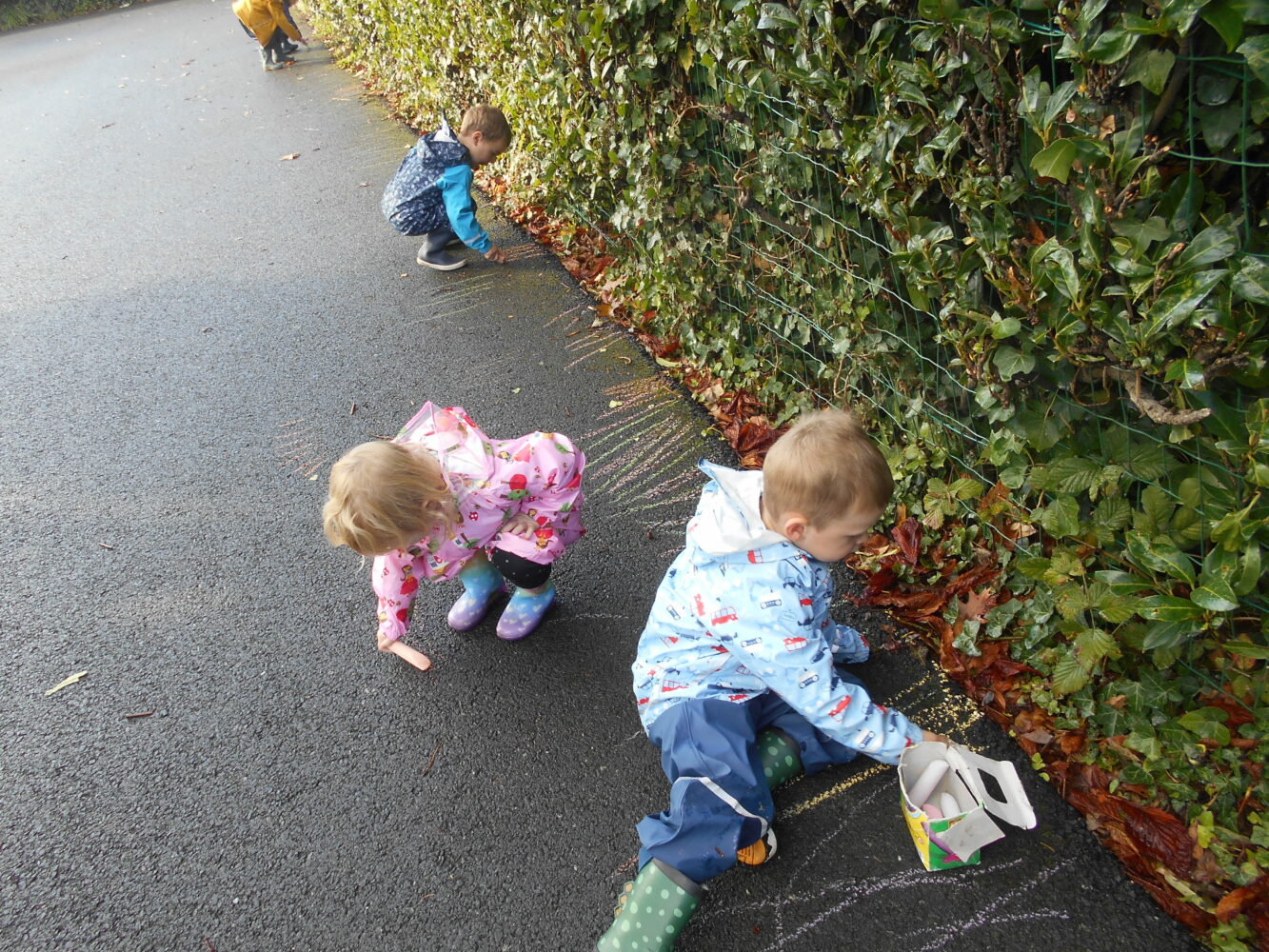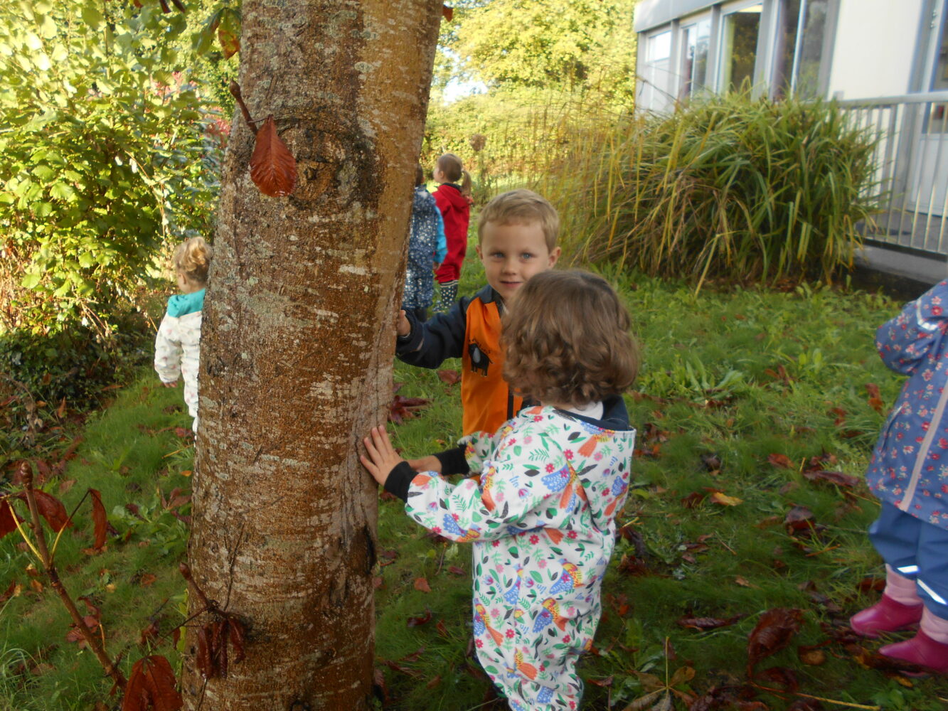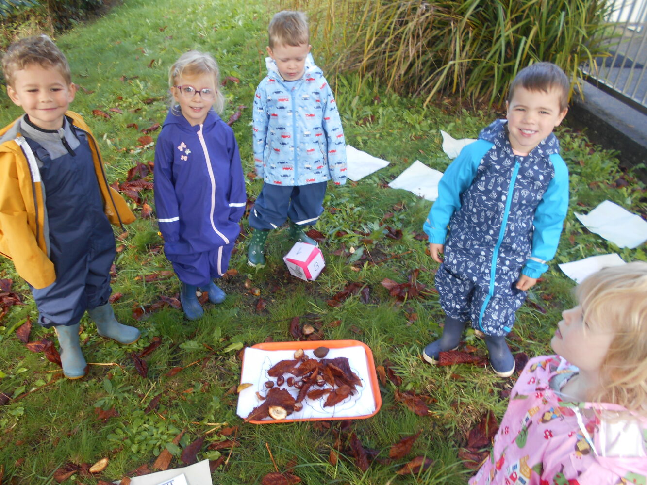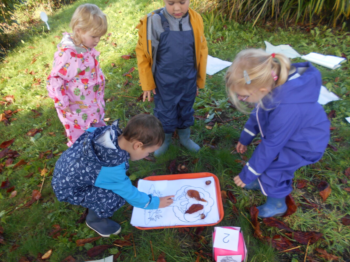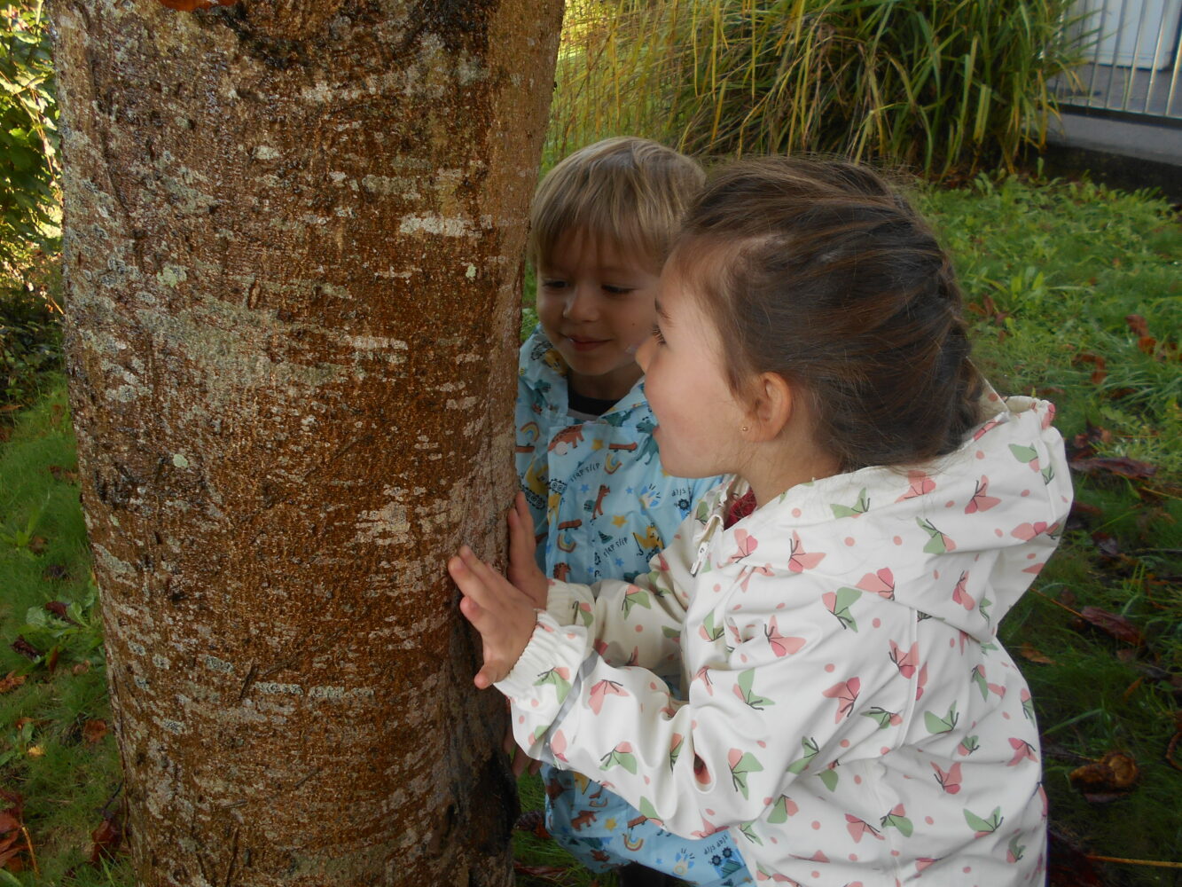 Nous avons commencé par découvrir le marronnier et dire bonjour à la nature en le touchant. Nous nous sommes ensuite installés en regroupement pour se connecter quelques minutes avec la nature : écouter les bruits, observer la nature et découvrir les trois règles de sécurité : toujours voir un adulte, ne rien mettre à la bouche et ne pas abîmer la nature. Ensuite, nous avons participé aux ateliers en petits groupes : land art (décorer un hibou avec des éléments naturels), « jeu de l’arbre » en numération jusqu’ à 3, « la chasse aux couleurs », et les traits à la craie sur la cour pour le graphisme.