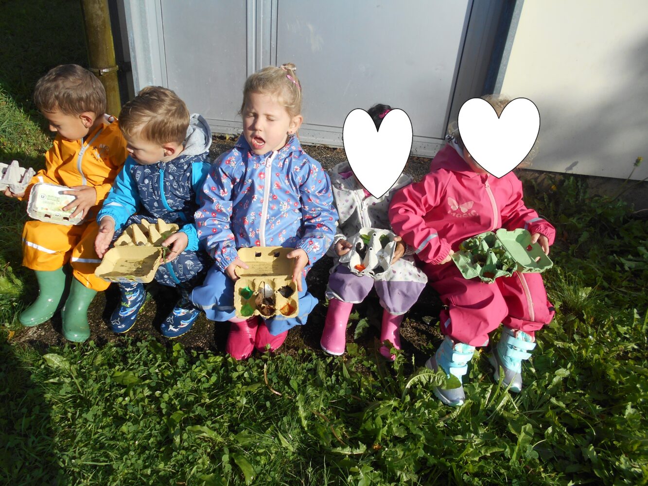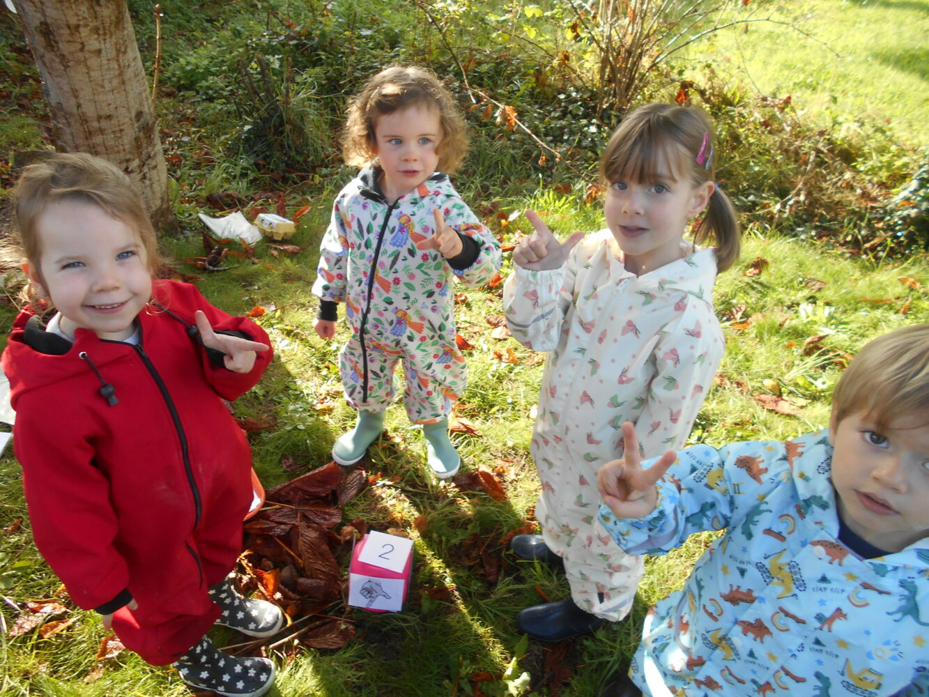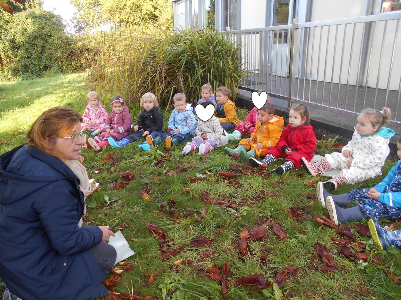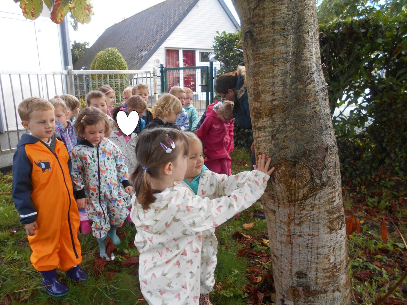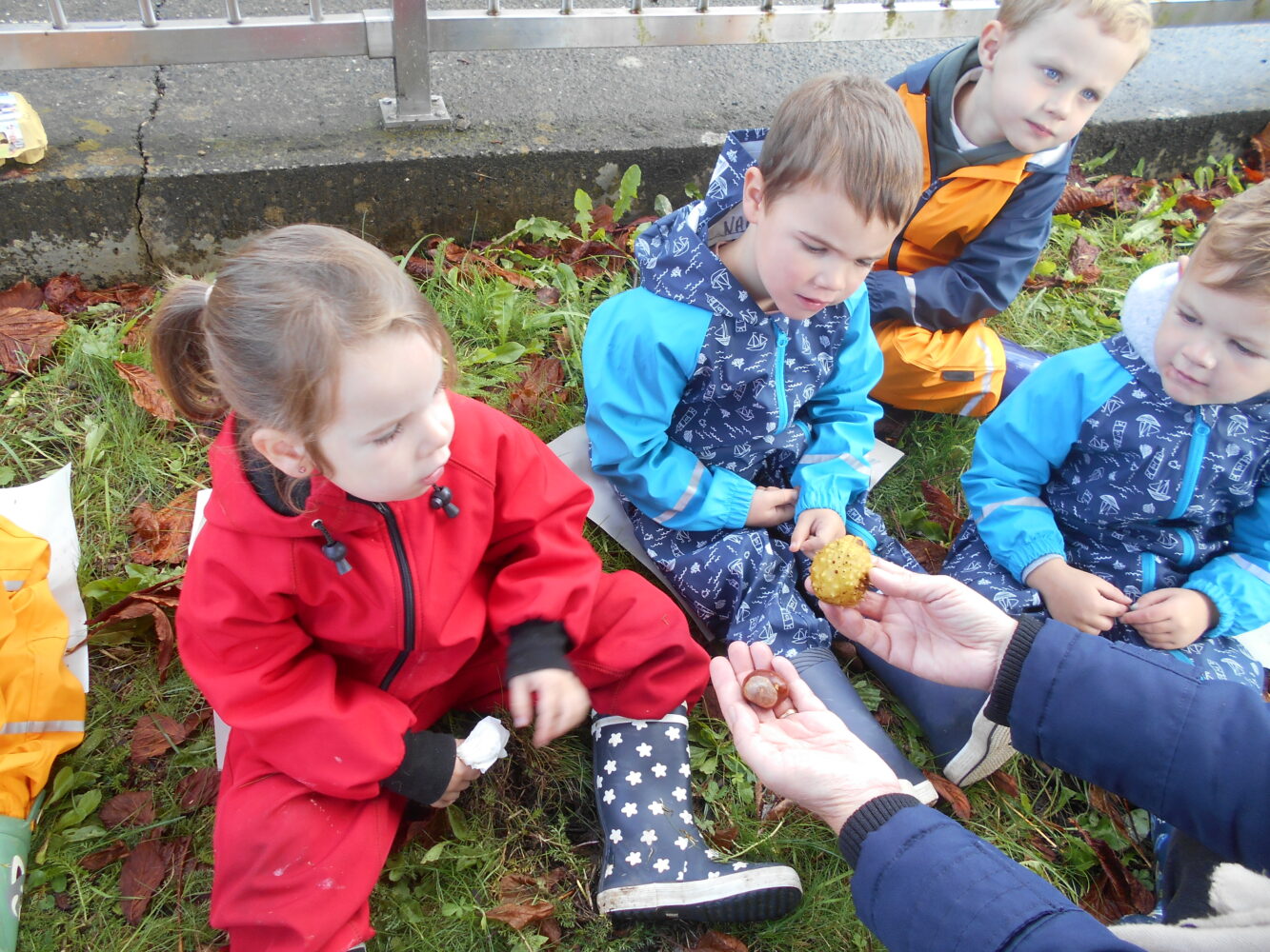 Nous avons commencé par découvrir le marronnier et dire bonjour à la nature en le touchant. Nous nous sommes ensuite installés en regroupement pour se connecter quelques minutes avec la nature : écouter les bruits, observer la nature et découvrir les trois règles de sécurité : toujours voir un adulte, ne rien mettre à la bouche et ne pas abîmer la nature. Ensuite, nous avons participé aux ateliers en petits groupes : land art (décorer un hibou avec des éléments naturels), « jeu de l’arbre » en numération jusqu’ à 3, « la chasse aux couleurs », et les traits à la craie sur la cour pour le graphisme.