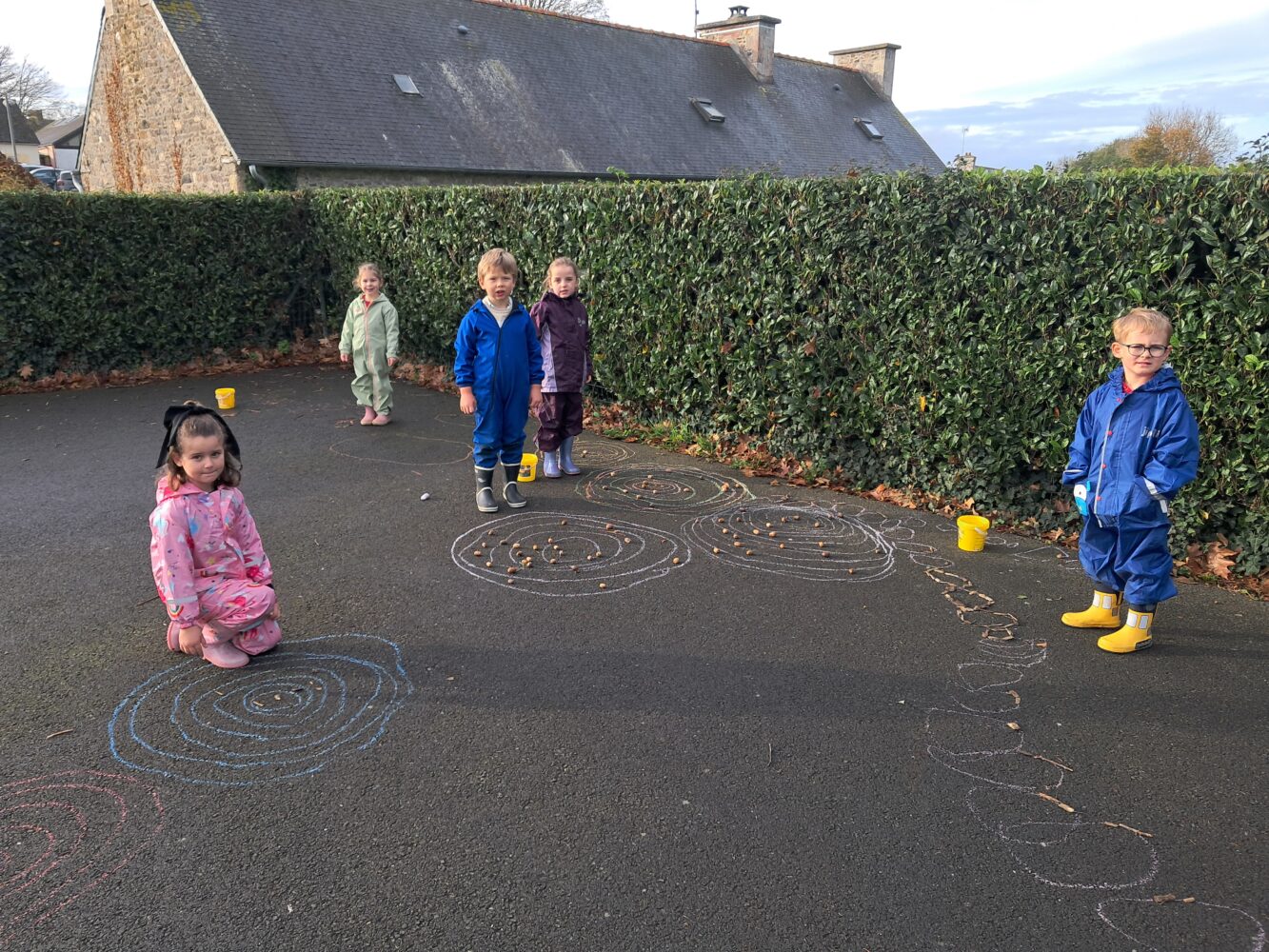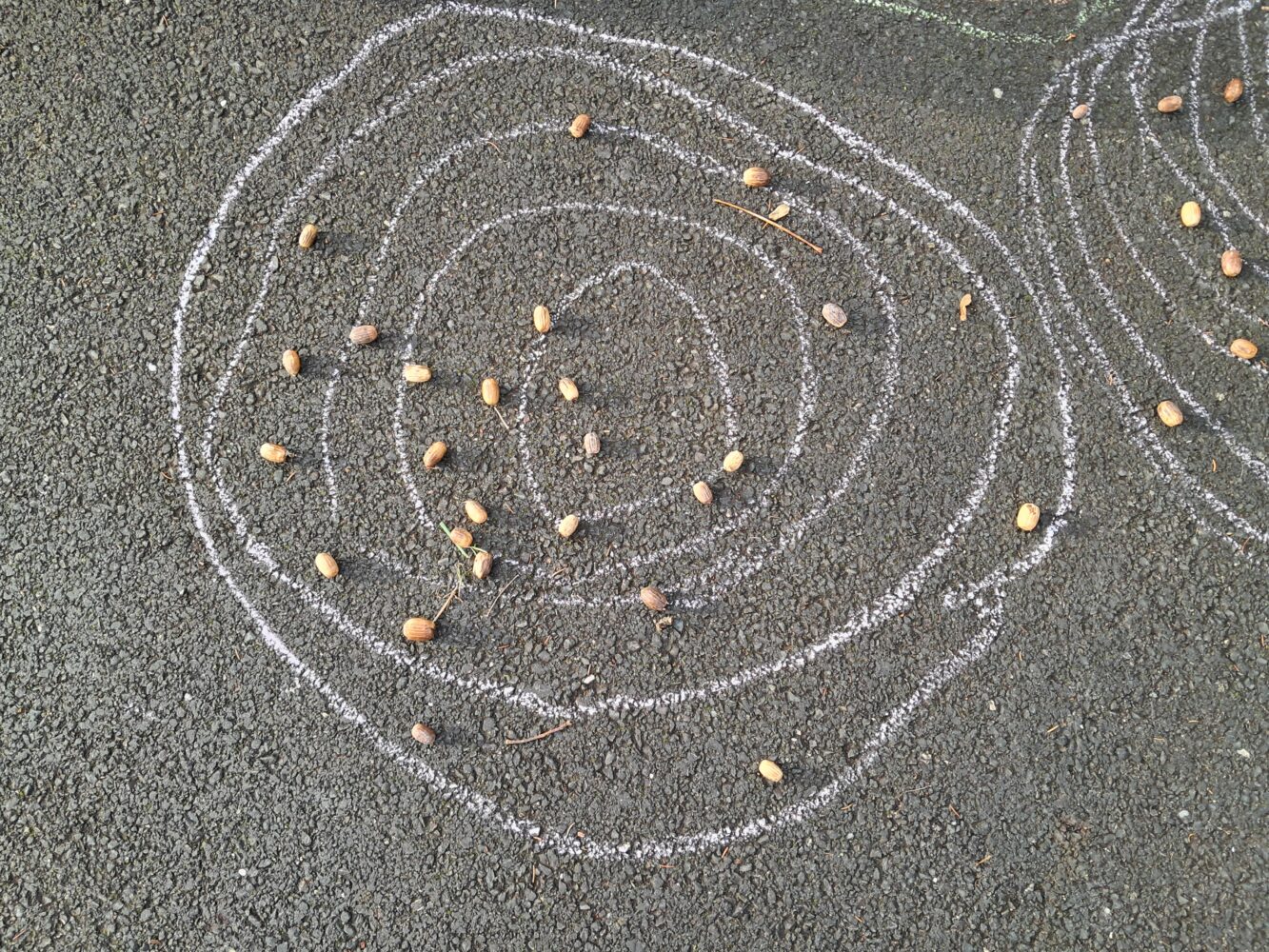 réaliser des ronds (MS), réaliser des ronds concentriques (GS) et les décorer avec des objets de la nature.