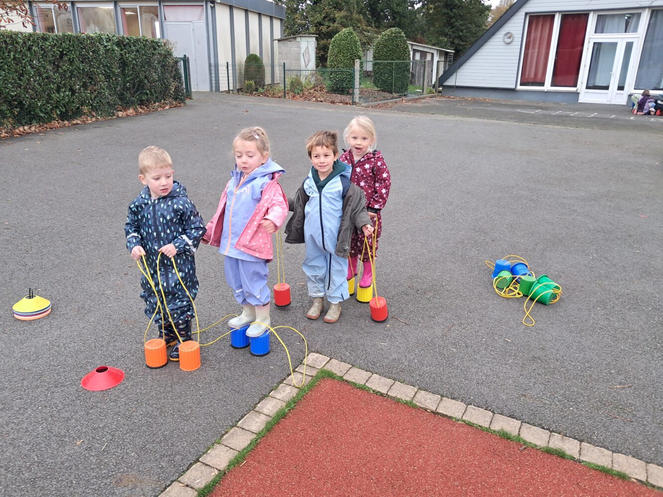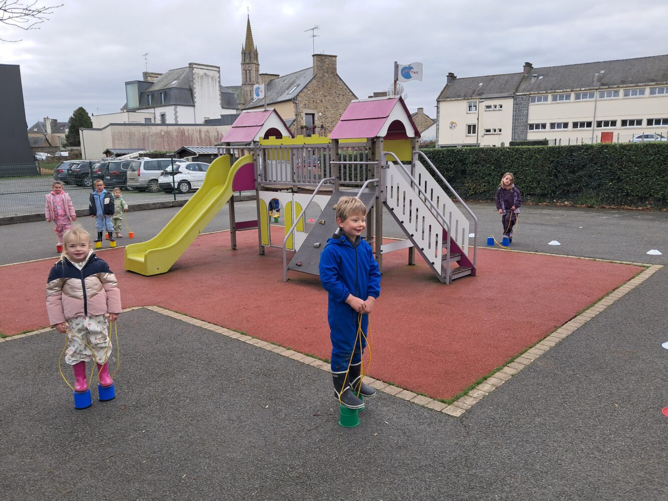 marcher en équilibre sur des échasses autour de la structure de jeux;