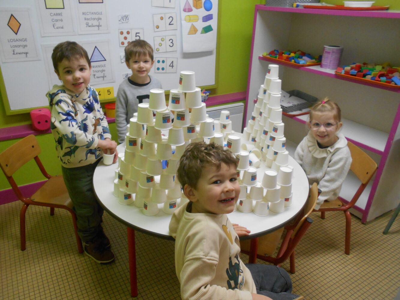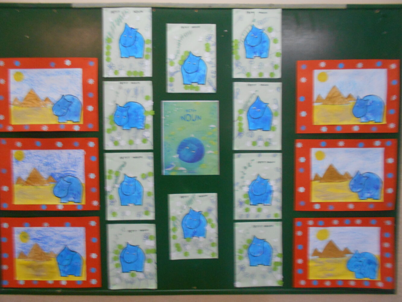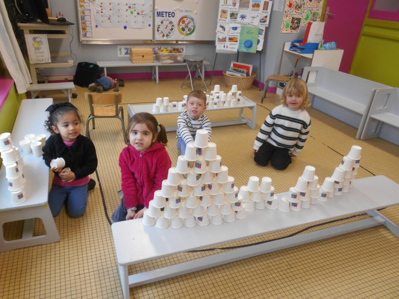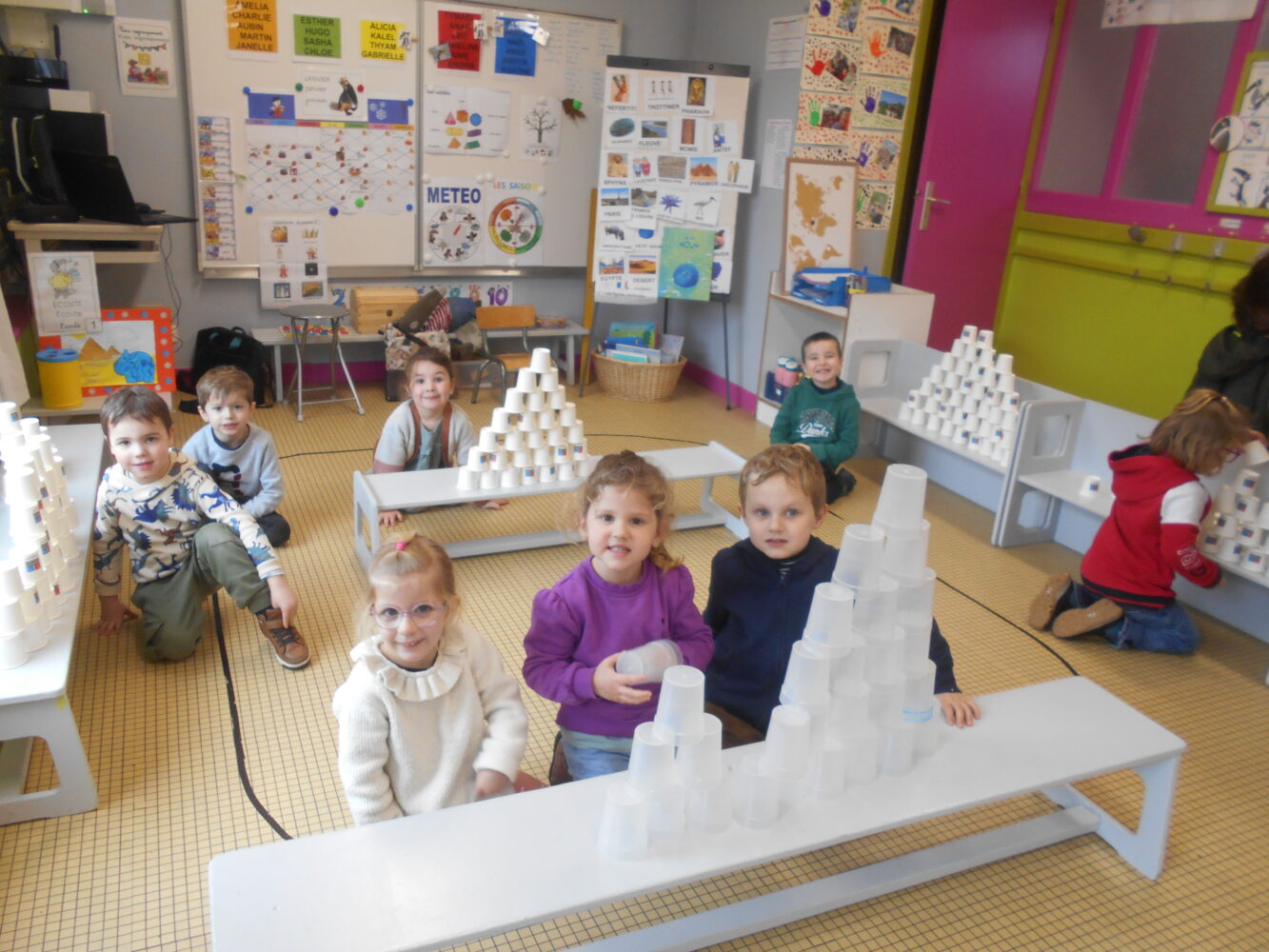 À travers des lectures, des échanges et différentes activités, ils ont découvert une civilisation fascinante et se sont enrichis d’un vocabulaire nouveau : pharaon,, momie, sarcophage, pyramide, désert….Ils ont découvert l’album Petit Noun, support permettant de réaliser de belles oeuvres et des pyramides avec des verres.