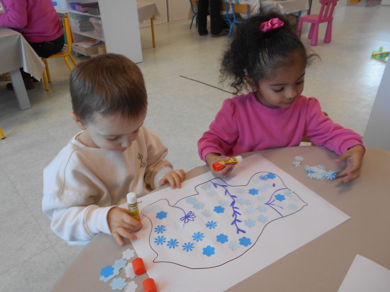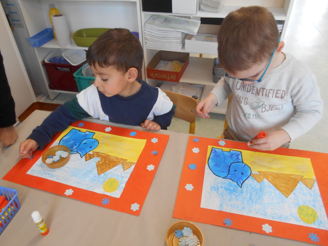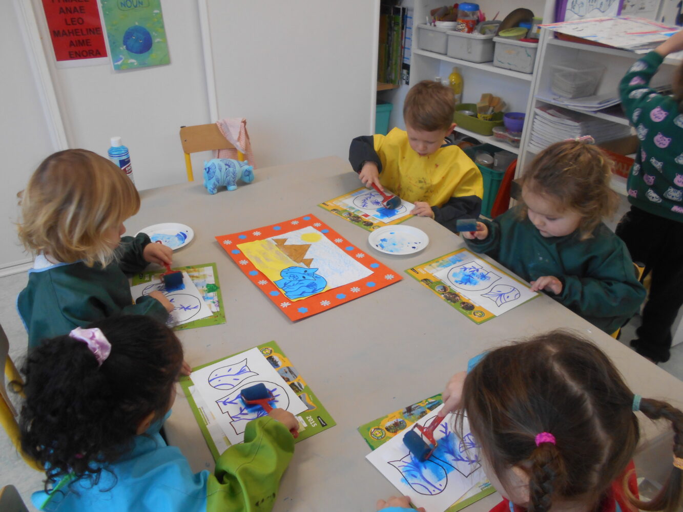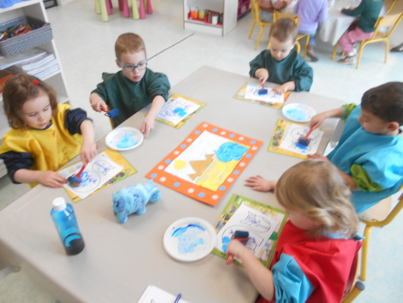 À travers des lectures, des échanges et différentes activités, ils ont découvert une civilisation fascinante et se sont enrichis d’un vocabulaire nouveau : pharaon,, momie, sarcophage, pyramide, désert….Ils ont découvert l’album Petit Noun, support permettant de réaliser de belles oeuvres et des pyramides avec des verres.