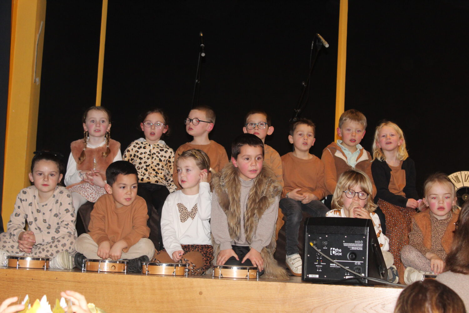 Le rideau s’est ouvert sur la Préhistoire avec les PS et MS, qui ont fait apparaître de joyeux dinosaures, apportant l’écaille du dinosaure, premier élément indispensable pour réparer le temps. Les MS et GS ont ensuite incarné les hommes et les femmes de la Préhistoire, offrant la pierre du feu, symbole des débuts de l’humanité.