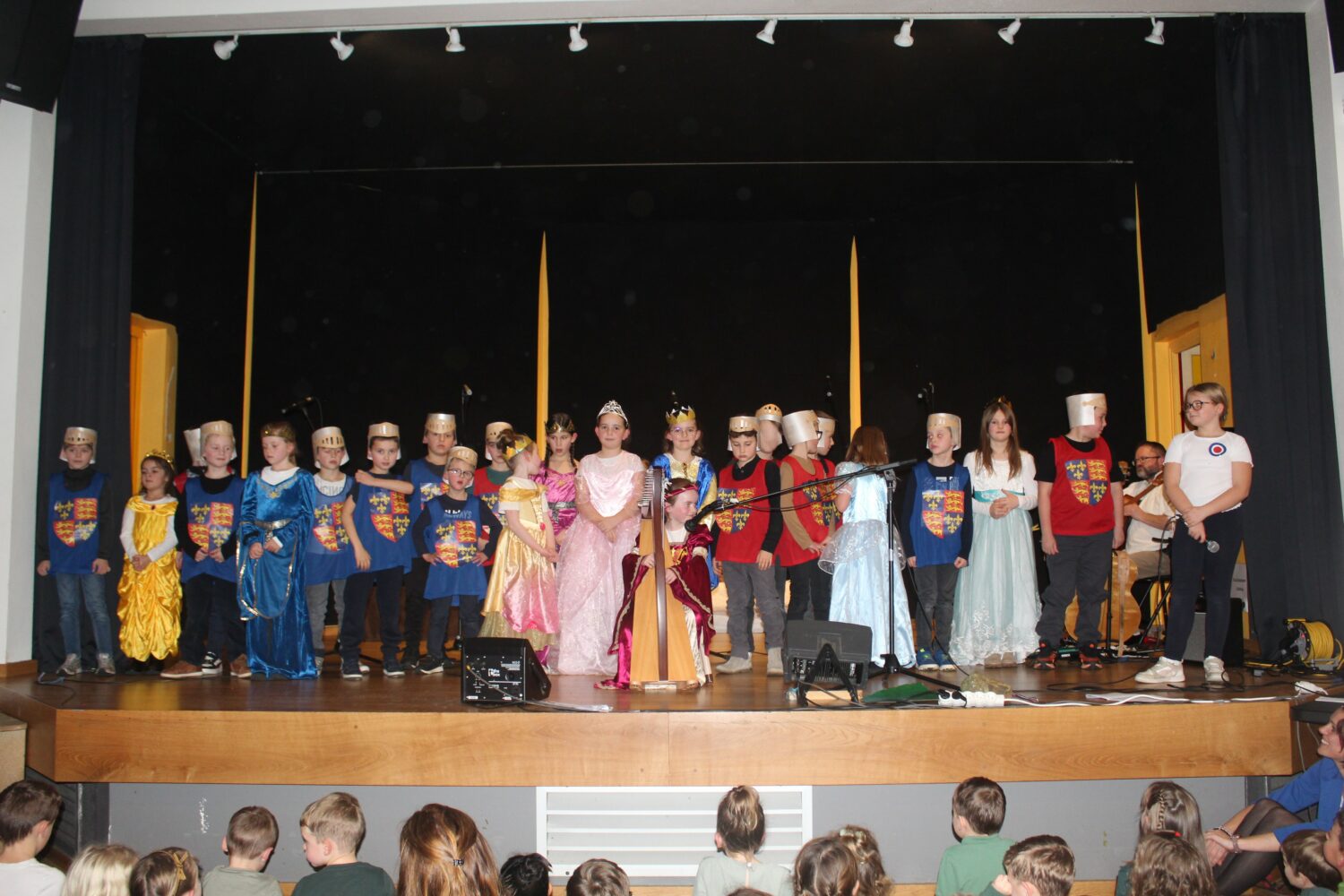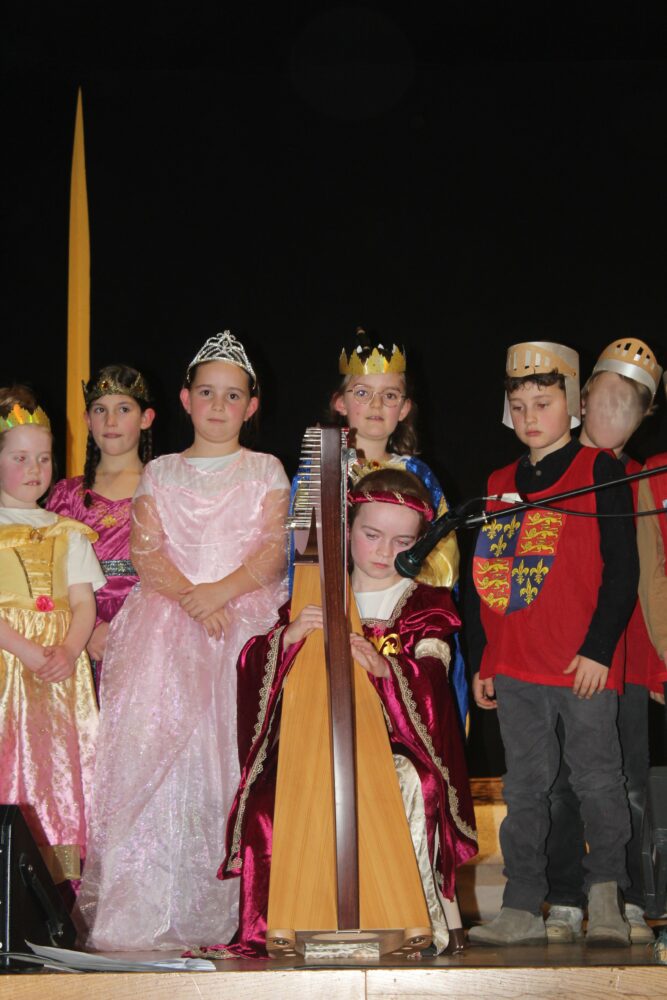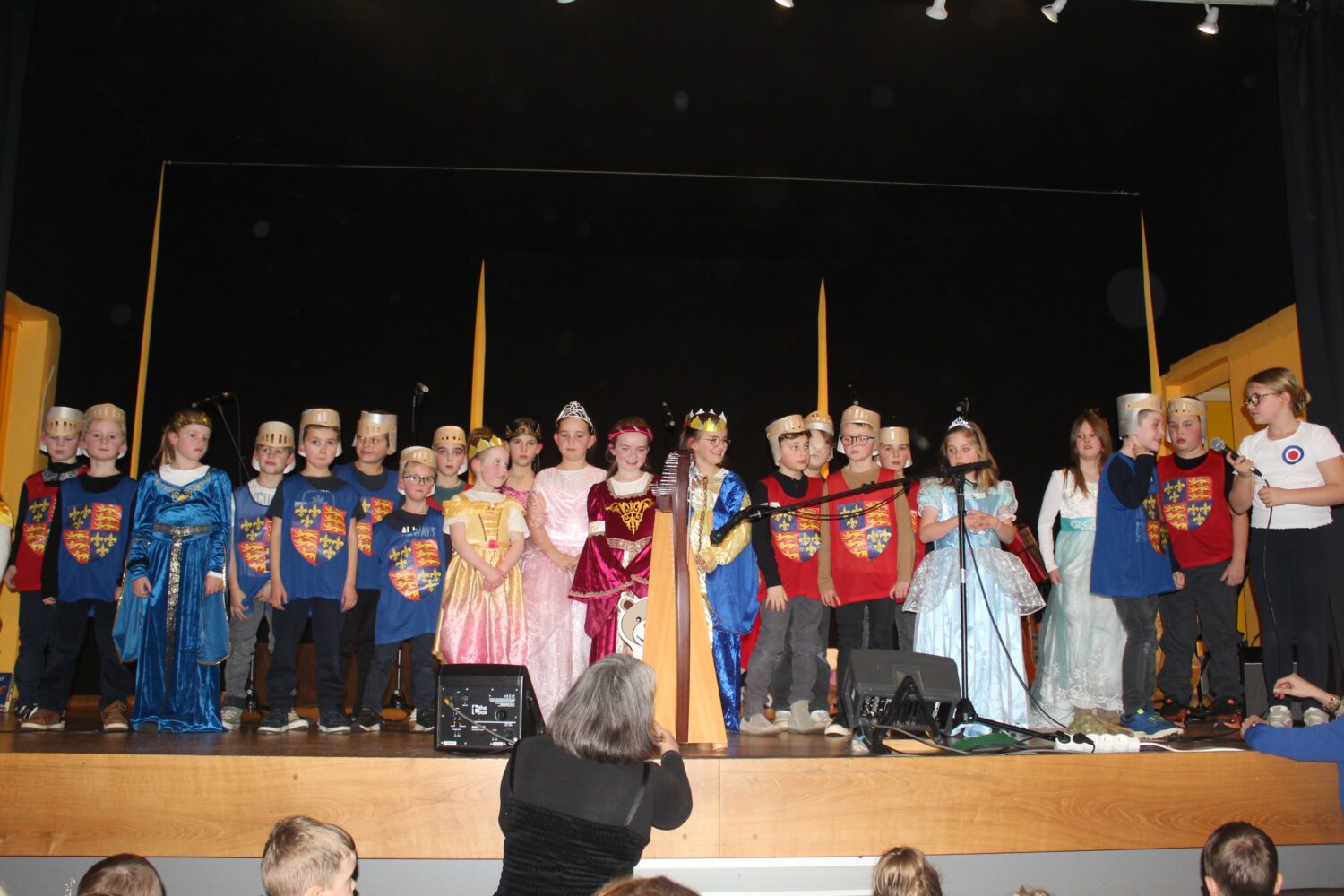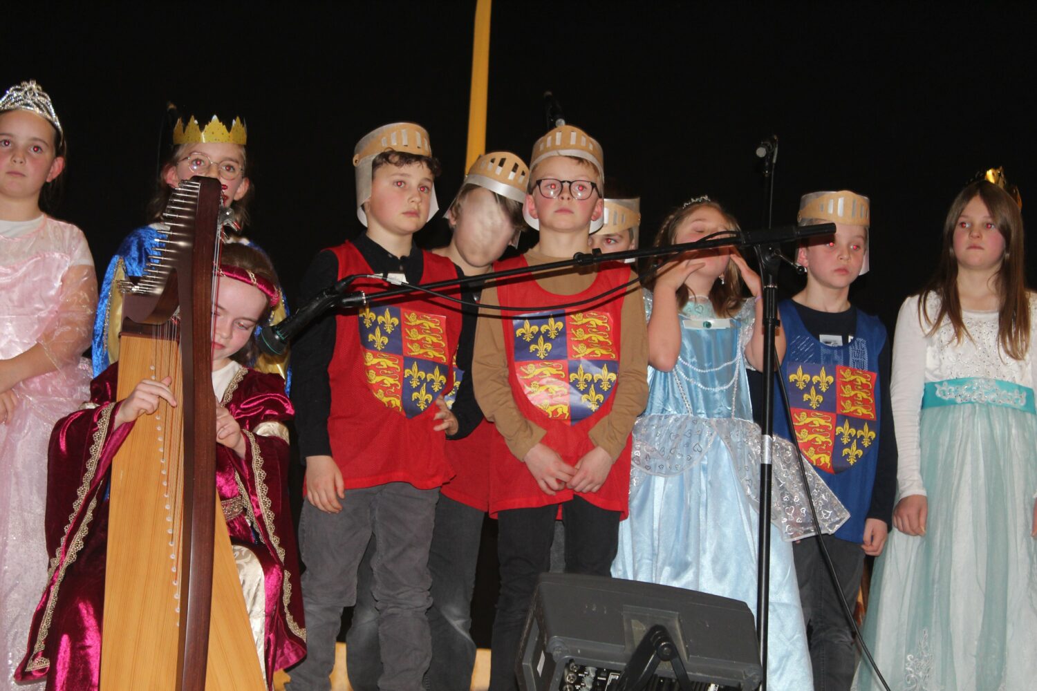 Au Moyen Âge, les CE1 et CE2 ont fait entrer en scène chevaliers et princesses, apportant la plume, symbole du savoir et de la transmission. A ce moment, le temps a semblé suspendu lorsque Juliette a enchanté le public avec sa harpe.