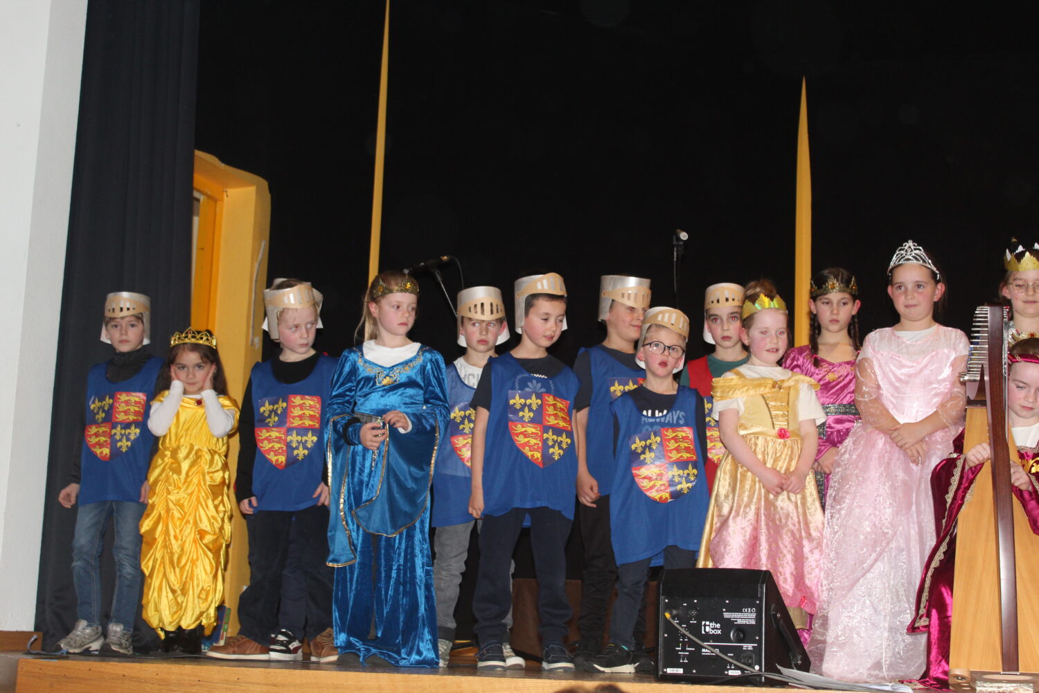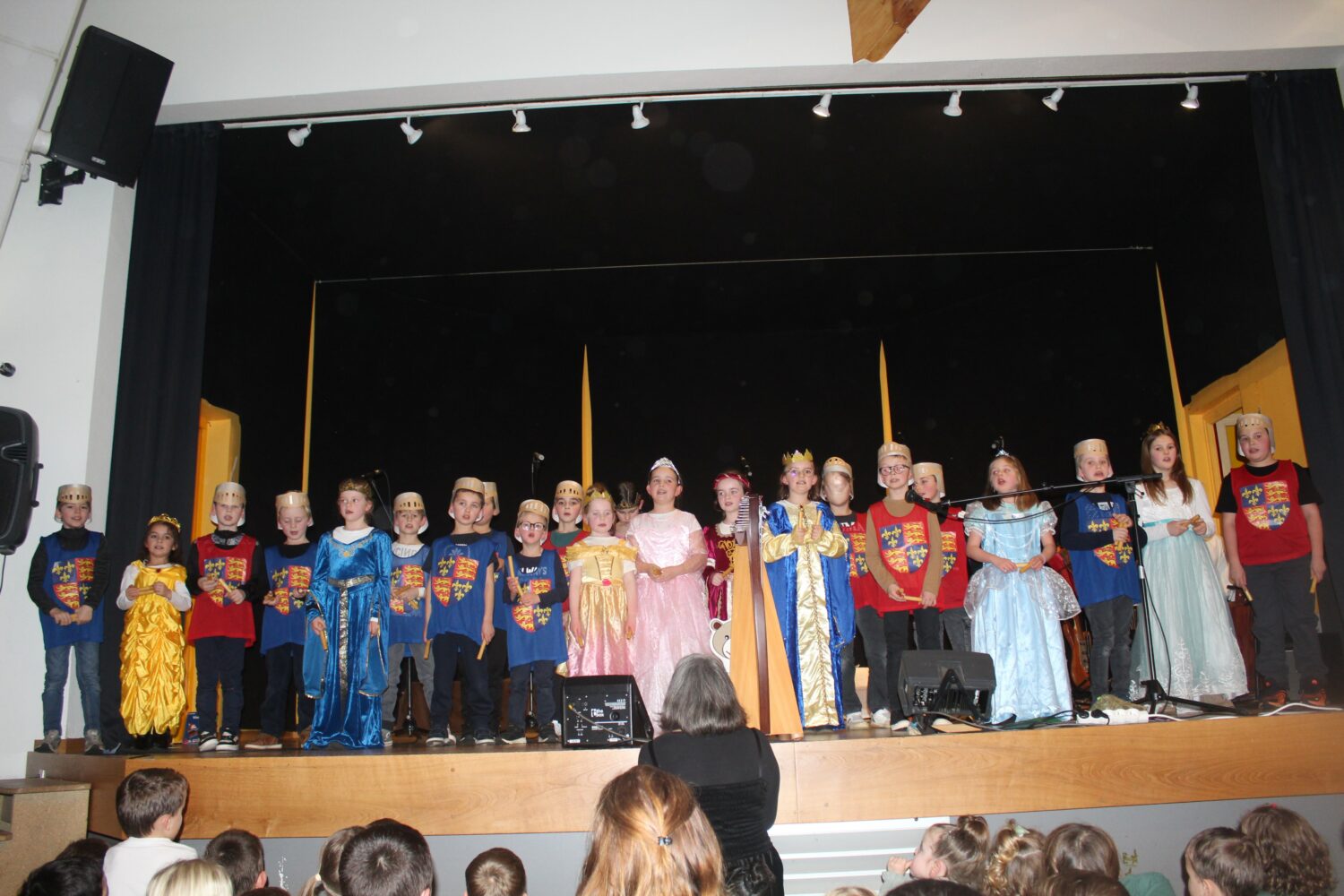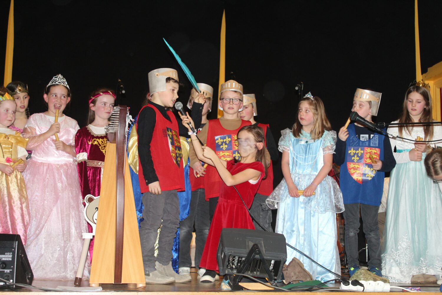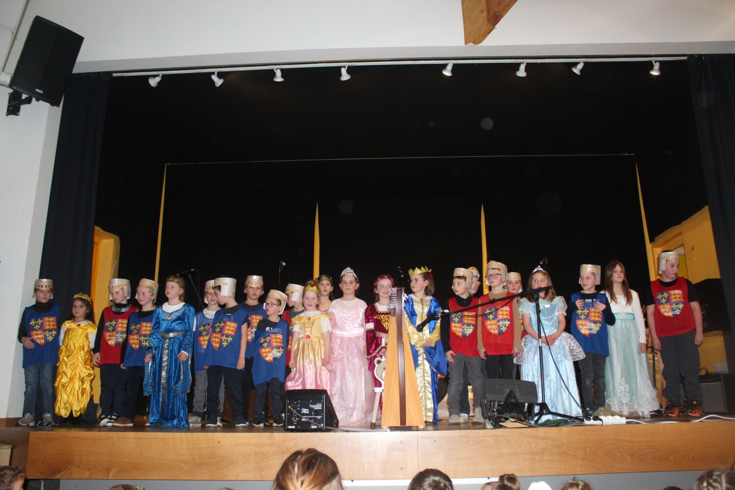 Au Moyen Âge, les CE1 et CE2 ont fait entrer en scène chevaliers et princesses, apportant la plume, symbole du savoir et de la transmission. A ce moment, le temps a semblé suspendu lorsque Juliette a enchanté le public avec sa harpe.