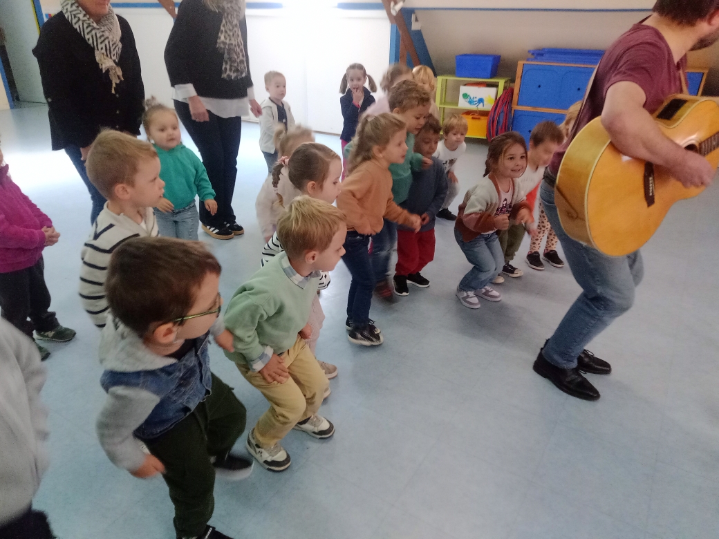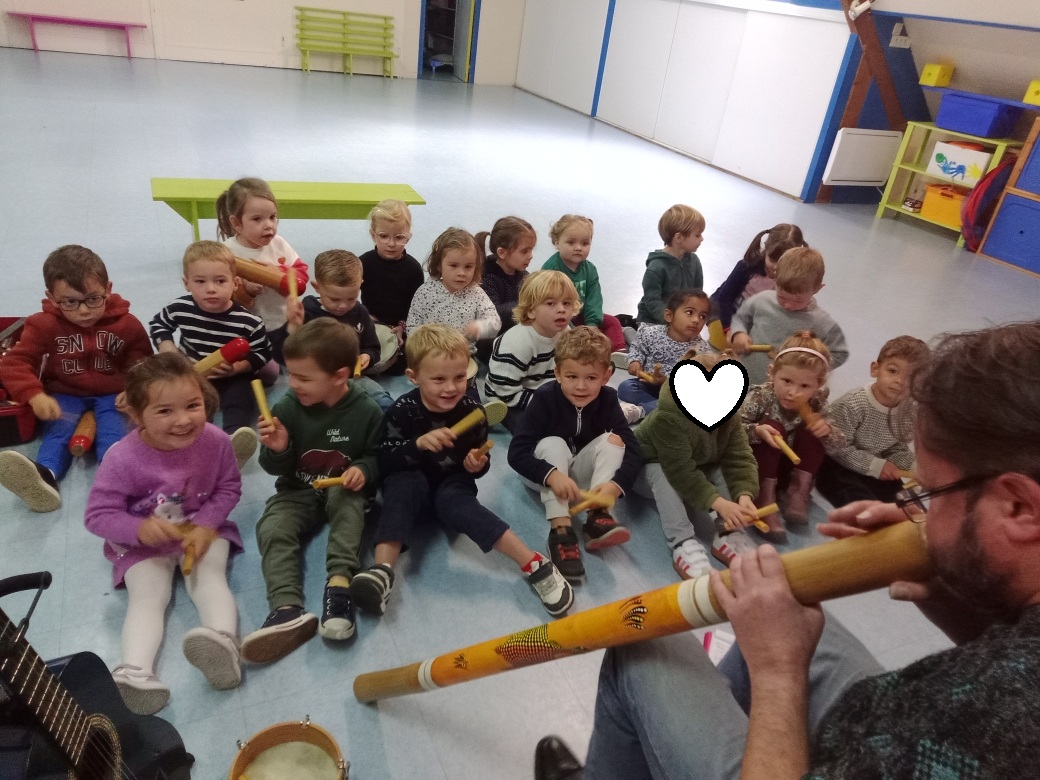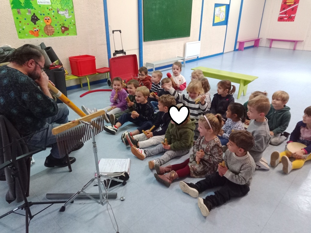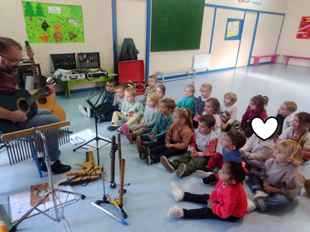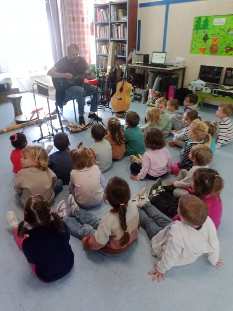 Depuis fin septembre, tous les lundis, nous bénéficions d’une demi-heure de musique animée par Stéphane Blanchard, musicien de la communauté du Leff Armor. Ces séances (10 au total) très appréciées par les élèves permettent d’élargir leurs horizons artistiques et culturels, leurs expressions verbales et corporelles : mémorisation de chants, danses, découverte et manipulation d’instruments de musique